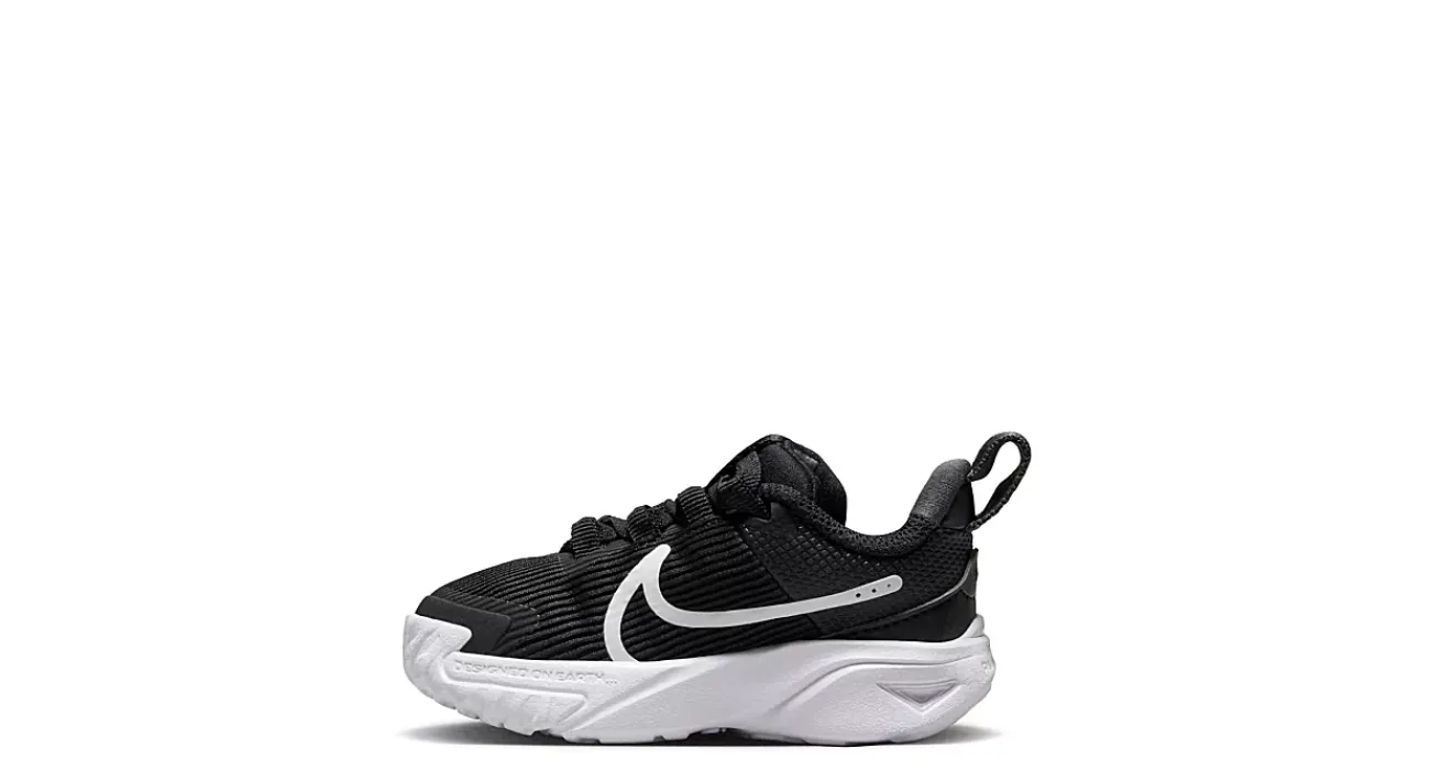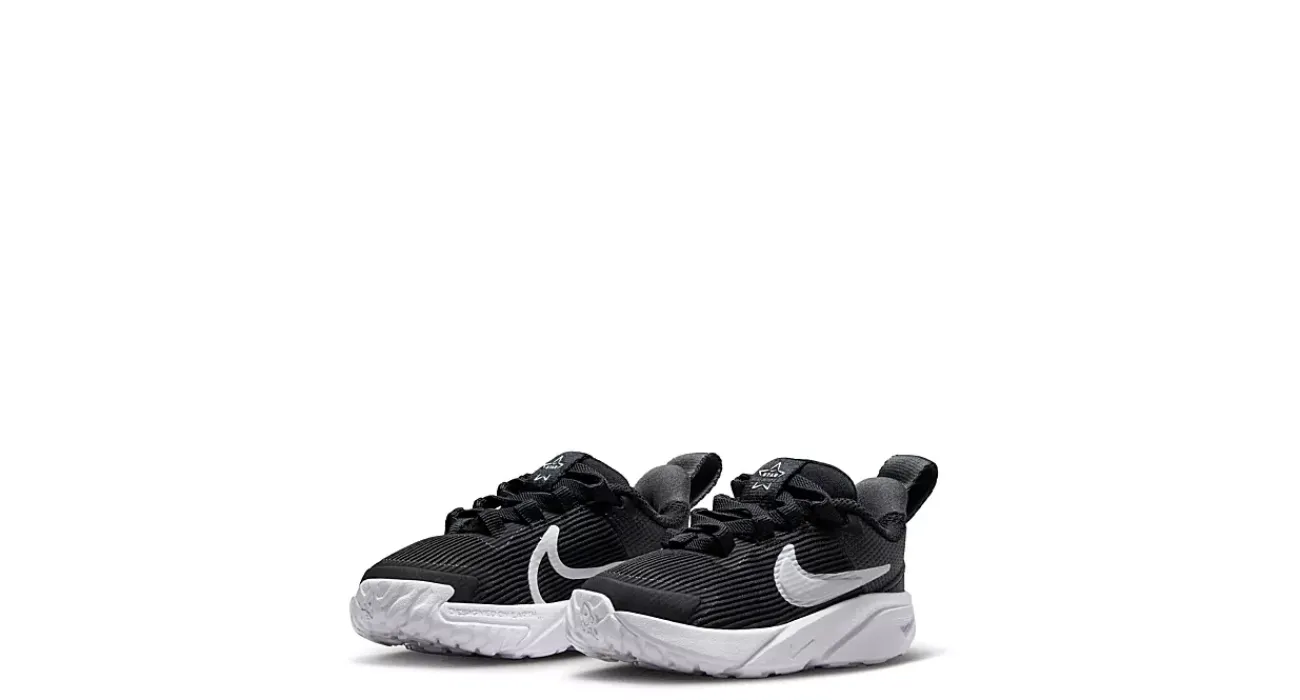 Let him run free in the Nike Star Runner 4 infant/toddler boys’ sneaker. With a partially recycled vertical mesh & synthetic upper featuring a durable toe skin, these shoes have a seamed tongue and heel system for easier entry with a secure lace-up front. The midsole cushions every step, while the outsole provides extra grip as he stays on the go.