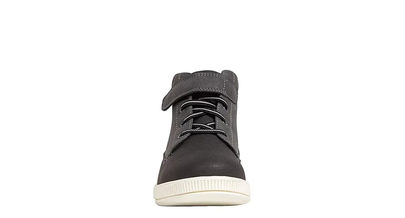 He can play or dress up in the Niles boys’ boot from Deer Stags. With a faux leather upper featuring a mesh lining for breathability, this hook & loop strap sneaker boot hybrid has no-tie bungee laces for easy entry. The insole cushions his foot while the athletic-styled sole flexibly support his movement.