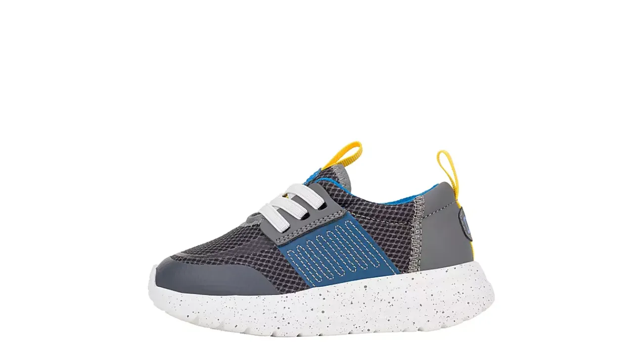 He’ll enjoy every step in the HEYDUDE Sirocco Play Toddler sneaker. With a colorblock mesh upper, treated with water repellent spray, featuring dual pull tabs for easy entry, this slip-on sneaker is summer ready. The removable insole cushions his little foot, while the lightweight outsole keeps him going for hours.