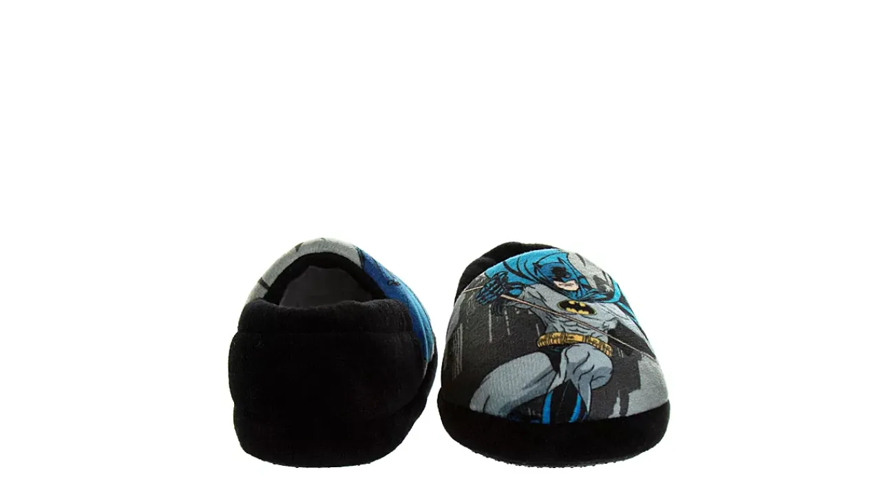 Wrap his little feet in caped crusading fun with the Batman infant boys’ slipper. Featuring a fabric upper with a prominent Batman graphic and a plush trim & lining, this slipper is perfect for lounging. The footbed cushions while the textured outsole offers non-slip grip.
