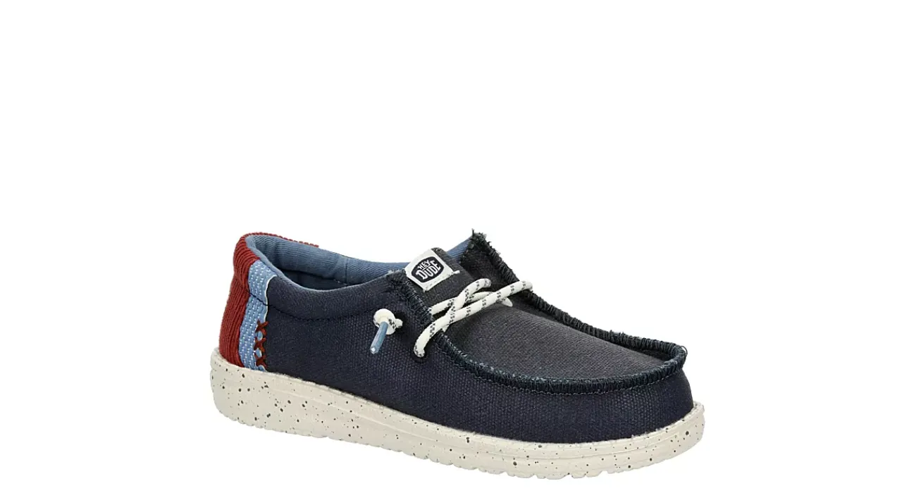 Relax in style with the HEYDUDE Wally Break Hey Day slip-on sneaker. With a canvas upper featuring a cotton lining for breathability, this funky shoe has Flex & Fold technology and contrast accents. The insole supports every step while the speckled midsole sets him free to explore unfettered.