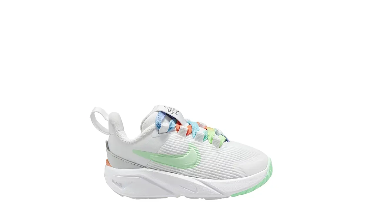 Let her run free in the Nike Star Runner 4 infant girls’ sneaker. With a partially recycled vertical mesh & synthetic upper featuring a durable toe skin, these shoes have a seamed tongue and heel system for easier entry with a secure lace-up front. The midsole cushions every step, while the outsole provides extra grip as she stays on the go.