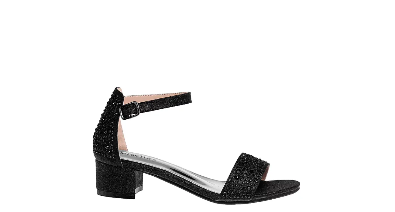 She’ll look stunning in the Badgley Mischka Glittery Low-Heel girls’ dress sandal. With a synthetic upper featuring rhinestone embellishments for extra flair, this buckle strap sandal brightens up any special occasion. The lightly cushioned footbed soothes her foot, while the low heel keeps her stable.