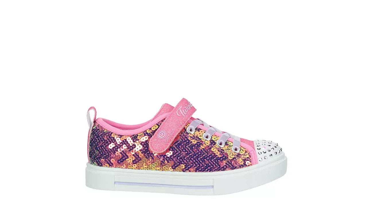Stay flashy in the Twinkle Toes: Twinkle Sparks – Sequin girls’ light up sneaker from Skechers. With a shimmery sequin embellished upper featuring a light-up rhinestud toe cap, this shoe has an on/off switch and an instep strap for a secure fit. The insole cushions her steps, while the outsole offers flexible traction.