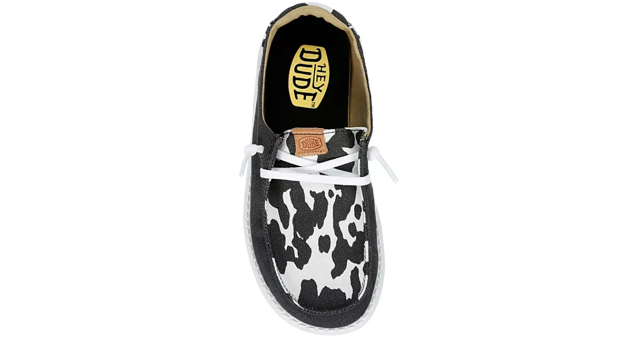 Relax as she roams in the cute and lightweight HEYDUDE Wendy Youth girls’ slip-on sneaker. With a knit upper featuring cow print details for extra style, these HEYDUDE shoes are machine washable for easy maintenance. The removable Memory Foam insole and leather lining offer ergonomic comfort and cushioning while the ultralight EVA outsole sets her free to explore unfettered.