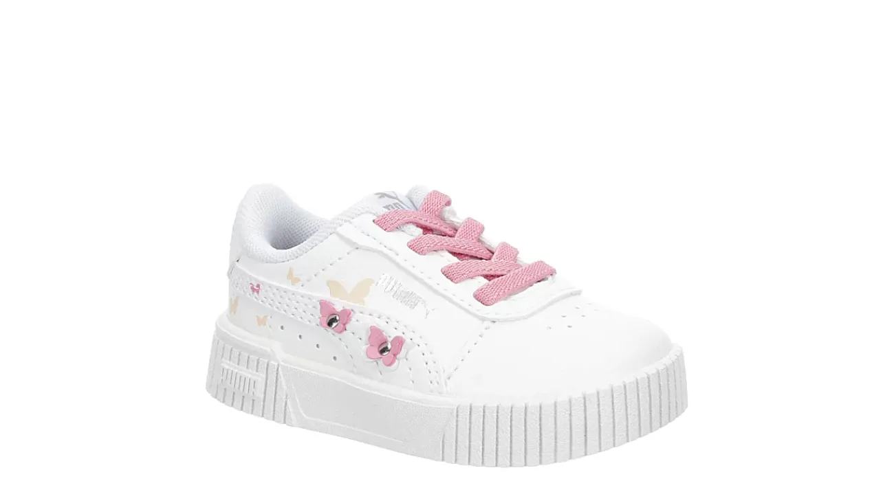 Dress your little princess in style with the Carina 2.0 Butterfly infant girls’ sneaker from PUMA. Featuring a faux leather upper with a butterfly accented PUMA Formstrip, this lace-up also has a padded collar & tongue for comfort. The SoftFoam+ sockliner cushions her foot, so exploring blooms in an instant thanks to the traction outsole.
