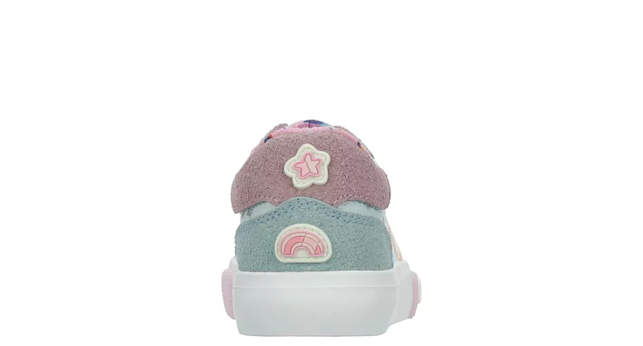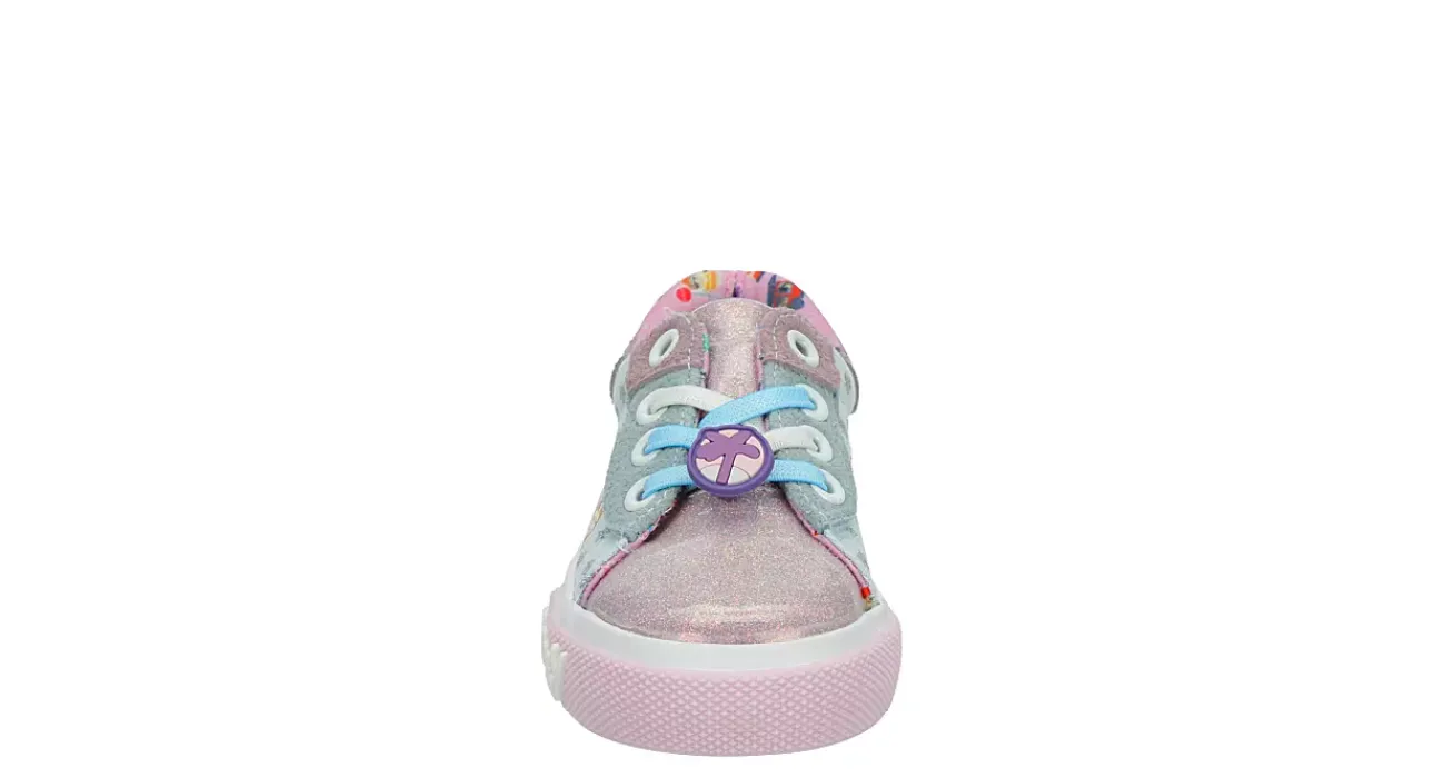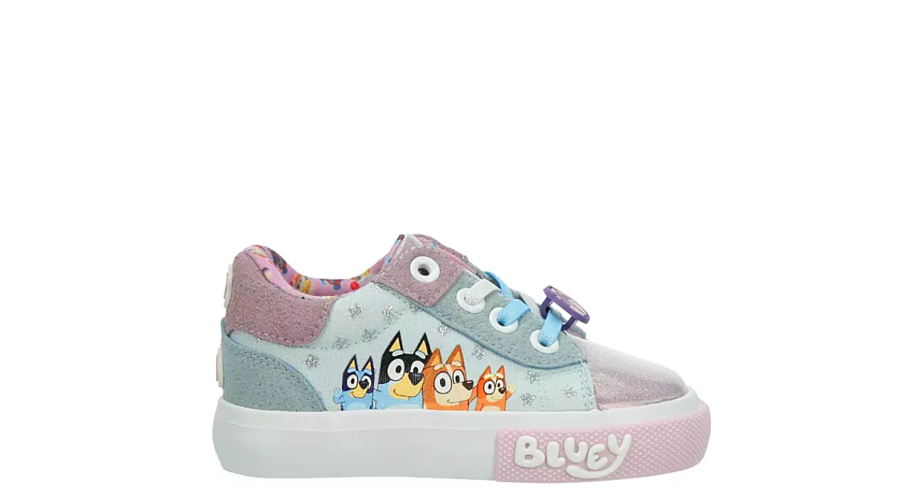 A nod to the popular series featuring a family of Australian cattle dogs, she’ll love the Bluey infant girls’ sneaker. Featuring a synthetic upper with the Bluey characters on the sides as well as the show’s logo along the midsole, this low-top shoe also has a fun lace applique.Let the glittery cap toe make her feel like the star of daycare.