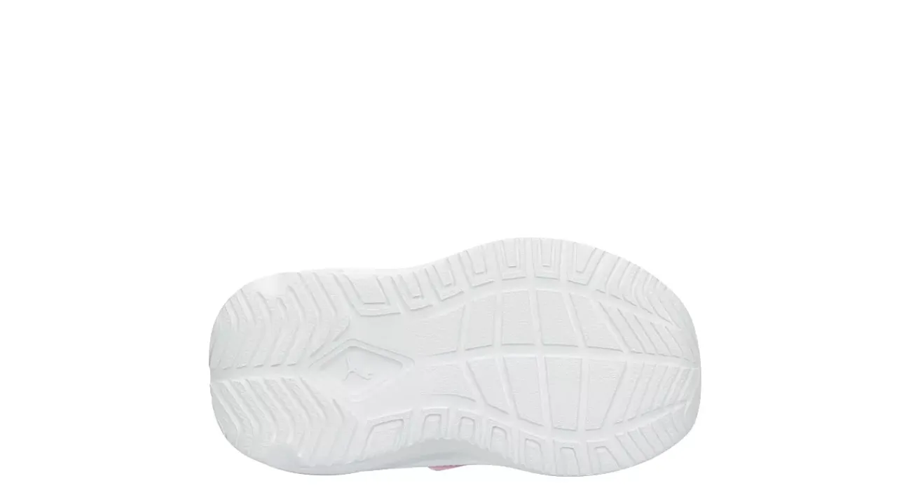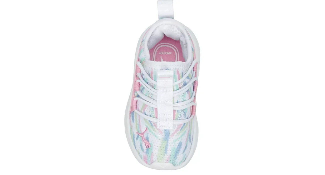 She’ll look too cute in the PUMA Softride One4All infant girls’ sneaker. With a mesh & synthetic upper featuring dual pull tabs for easy entry, this rainbow brush printed shoe is versatile enough to keep up with her. The foam footbed & colorful SOFTRIDE midsole cushion every step while the outsole offers bouncy traction.