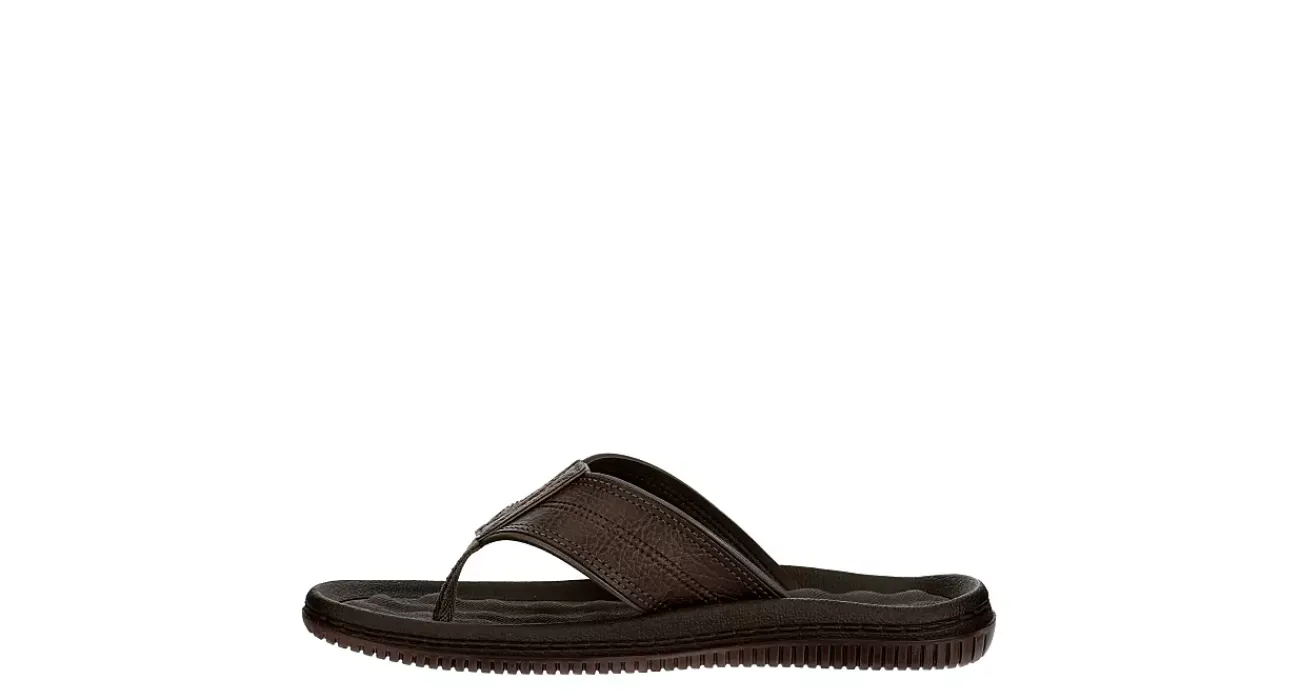 Kick off your summer style in the Bjorndal Dunas men’s flip flop sandal. With a recycled faux leather upper featuring a thong toe post for a secure fit, this flip flop looks good with shorts or jeans. The cushioned insole & contoured footbed ensure your comfort while the traction outsole offers durability to go farther down the beach or back to the lounge.
