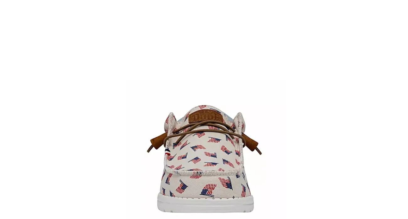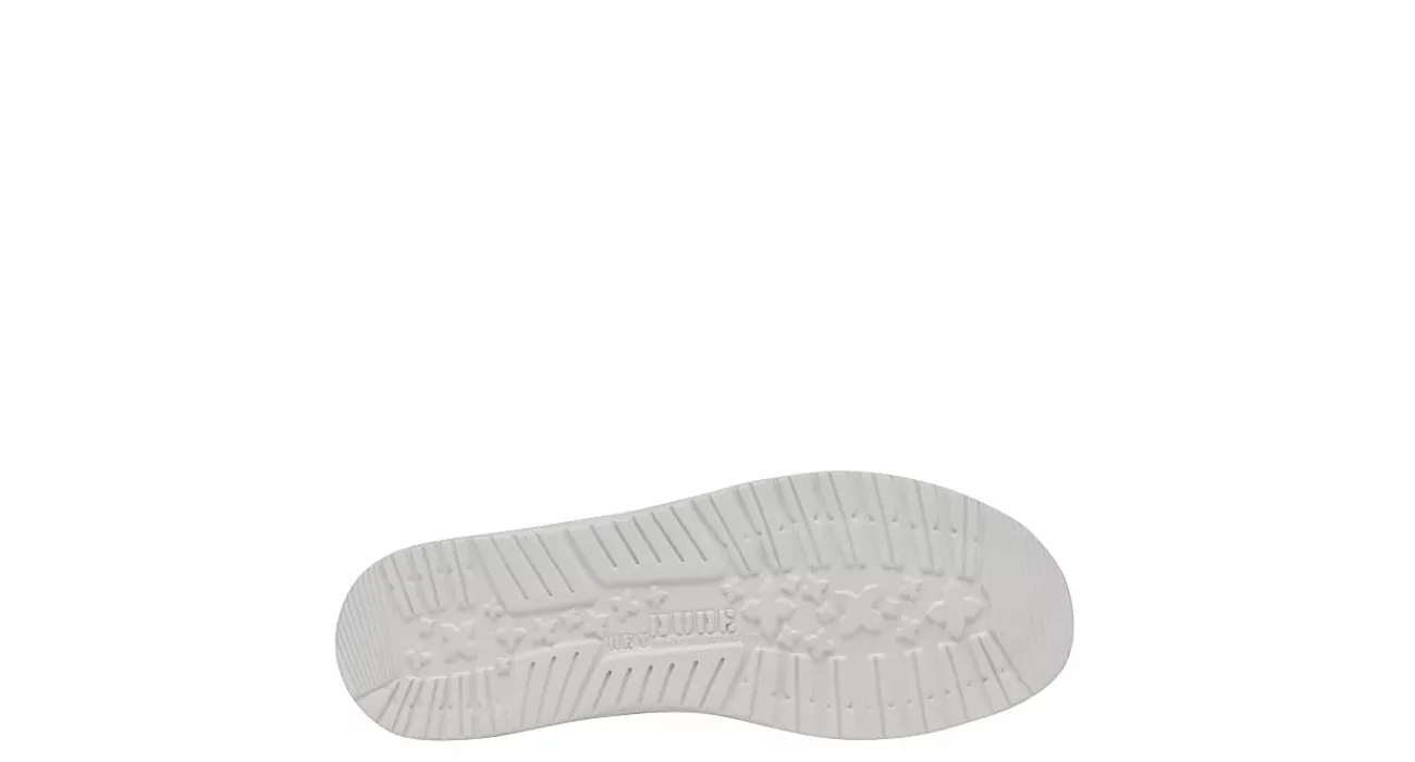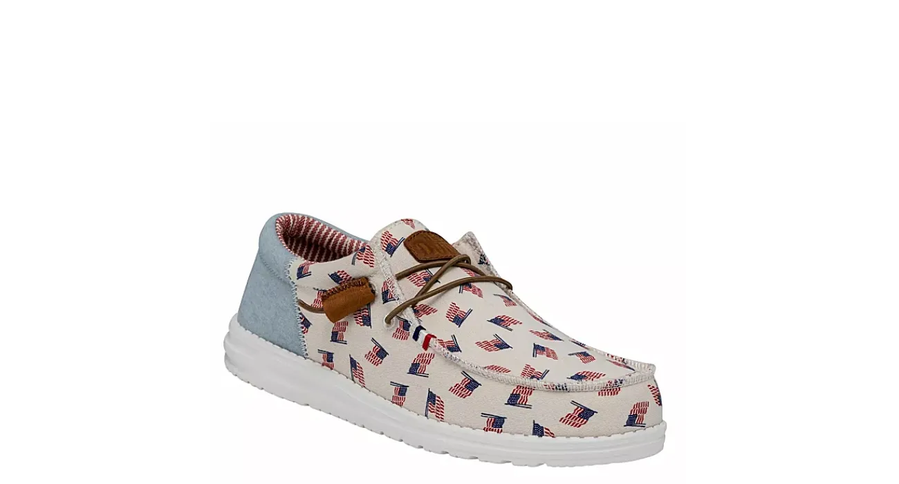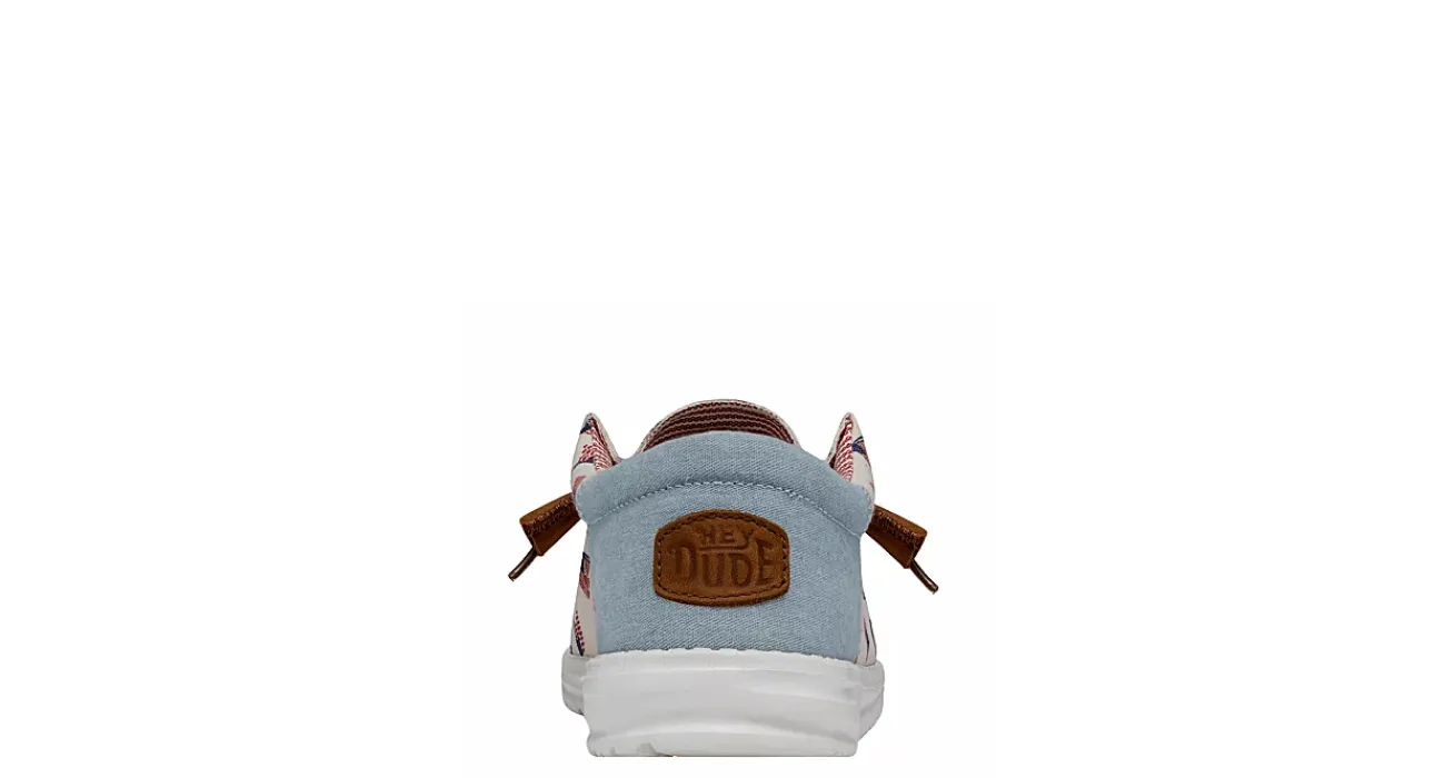Showcase your pride with the HEYDUDE Wally Americana men’s slip-on sneaker. With a breathable textile upper featuring a padded ankle collar with a contrasting heel detail, this sneaker also has a printed sockliner. The removable foam insole offers cushioning, while the lightweight outsole is flexible enough to explore unfettered.