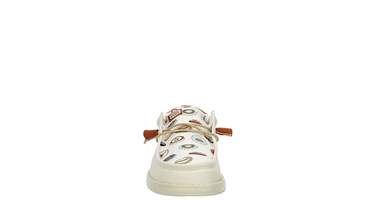 Relax into your time away with the HEYDUDE Wally Spring BreakR men’s slip-on sneaker. With a printed textile upper featuring a moc toe and contrasting heel detail, this slip-on shoe is perfect for the break. The removable insole offers cushioning, while the lightweight outsole is flexible enough to set you free to explore.