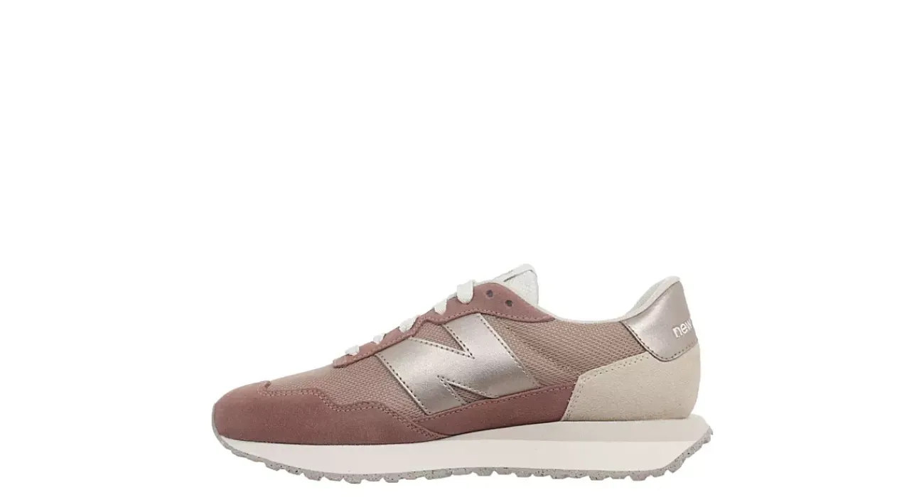 Reinterpreting the running heritage of the ’70s, the 237 women’s sneaker, inspired by the New Balance 327, combines simple style with modern performance. With a suede & nylon upper featuring gator-inspired foxing and an oversized N logo for vintage appeal, this lace-up shoe also has an exposed foam tongue for extra comfort. The EVA midsole cushions every step, while the herringbone outsole and mudguard protect stability.