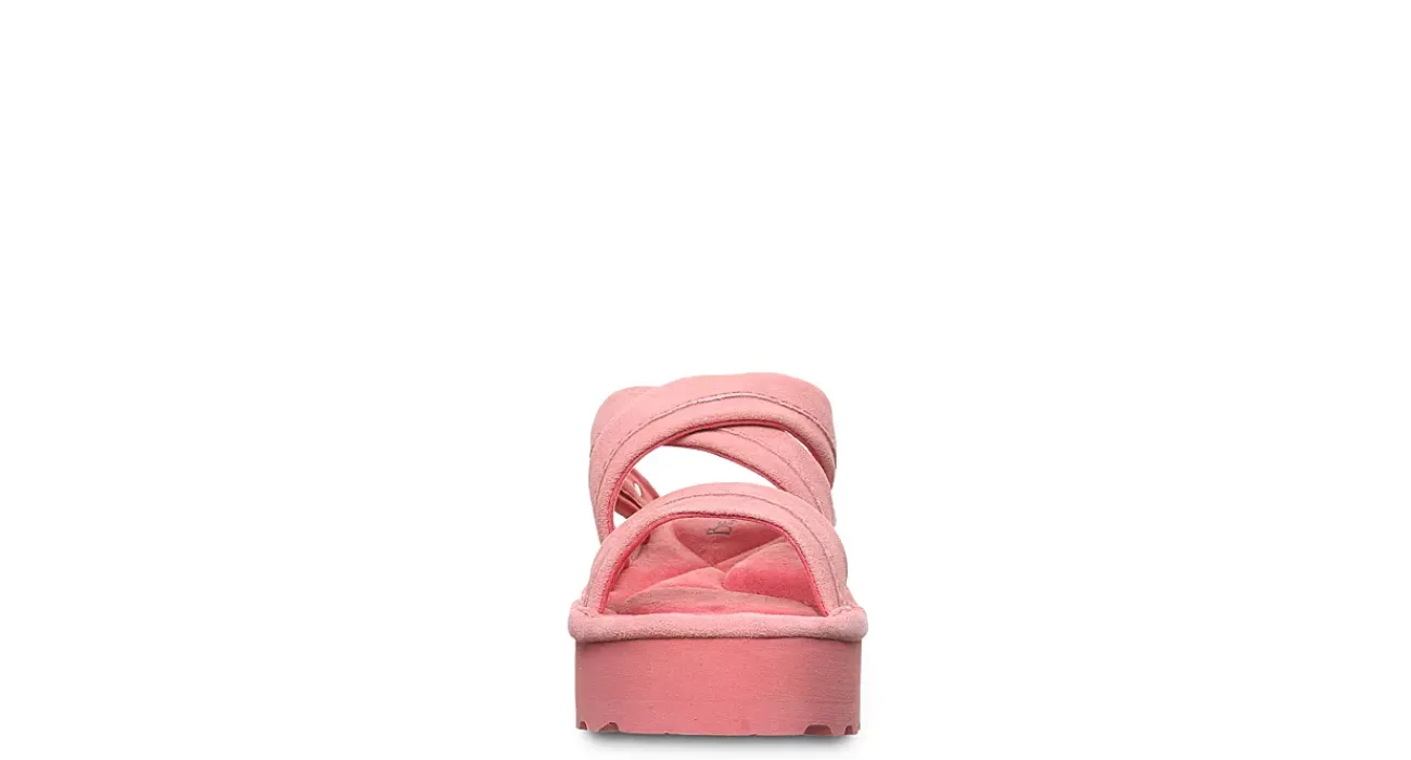 Take your style higher in the Altitude women’s slide sandal from Bearpaw. Featuring a suede upper with a faux leather lining, this flatform slide gives you that great slip-in feel. The quilted footbed cushions while the midsole & outsole offer just enough lift.