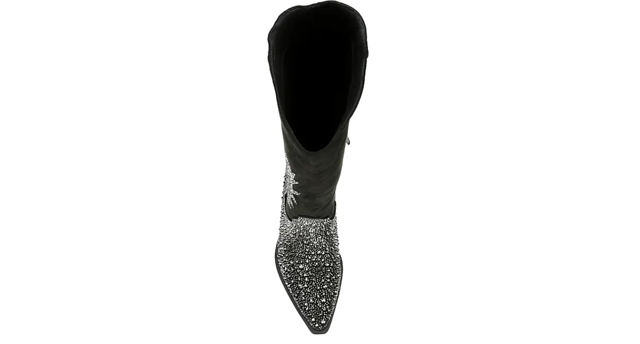 Scoot over to the rhinestone cowboy style of the Apple women’s Western boot from Steve Madden. Featuring a microsuede upper with an embellished design and pointed toe, this boot dazzles during line dances. The footbed soothes your foot, while the sturdy heel adds more than enough lift.