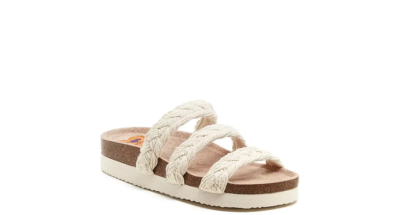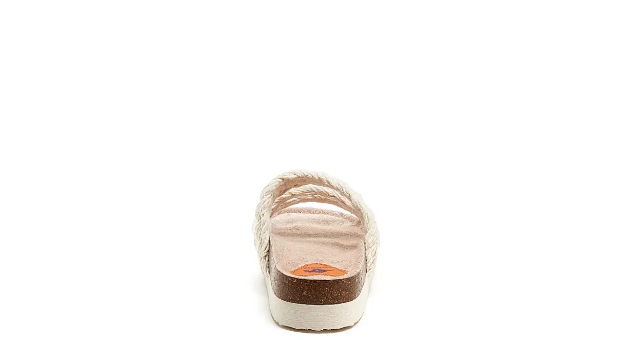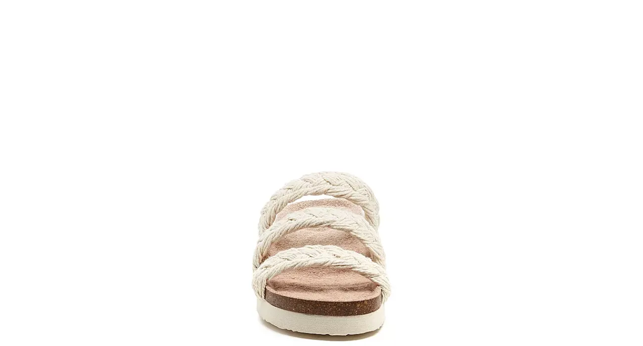 Loaf around home or head to the beach in the Ashley women’s footbed sandal from Rocket Dog. With a braided cotton upper and cushy terry cloth lining, this triple-strapped sandal fits snug. The molded footbed and slight platform lifts your foot, while the natural EVA outsole is durable.