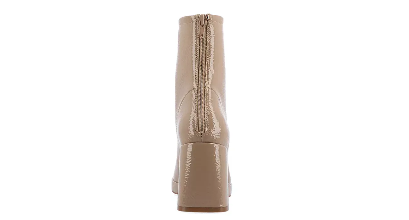 Show off minimalistic style, boldly done, in the Aylani women’s bootie from Journee Collection. With a crinkled, vegan patent leather upper featuring a 10″ circumference and roomy toe, this rear zip boot keeps your look and comfort on point. The Memory Foam insole cushions every step while the stable heel gives attention-grabbing height.