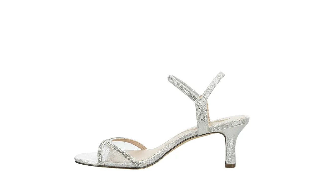 Dazzle your audience in the Barron sandal from N By Nina. With a glittery faux leather & mesh upper featuring a dainty mesh panel, this easy ankle strap sandal is dresses up special events. The footbed soothes your foot, while the kitten heel adds stable lift.