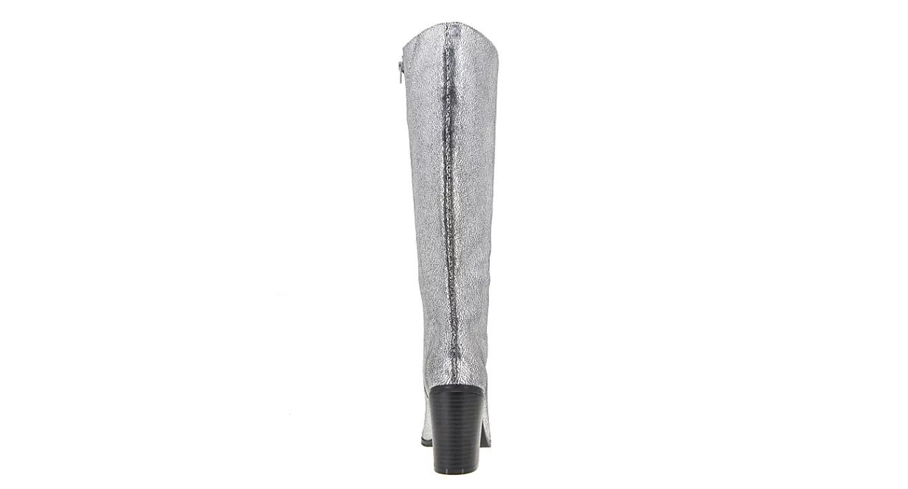 Cover and show off your legs in the Bella tall dress boot from XOXO. Featuring a glittery faux leather upper with an almond toe, this 14 3/4″ boot is primed for fall nights. The insole cushions your foot while the stable heel adds nice lift.