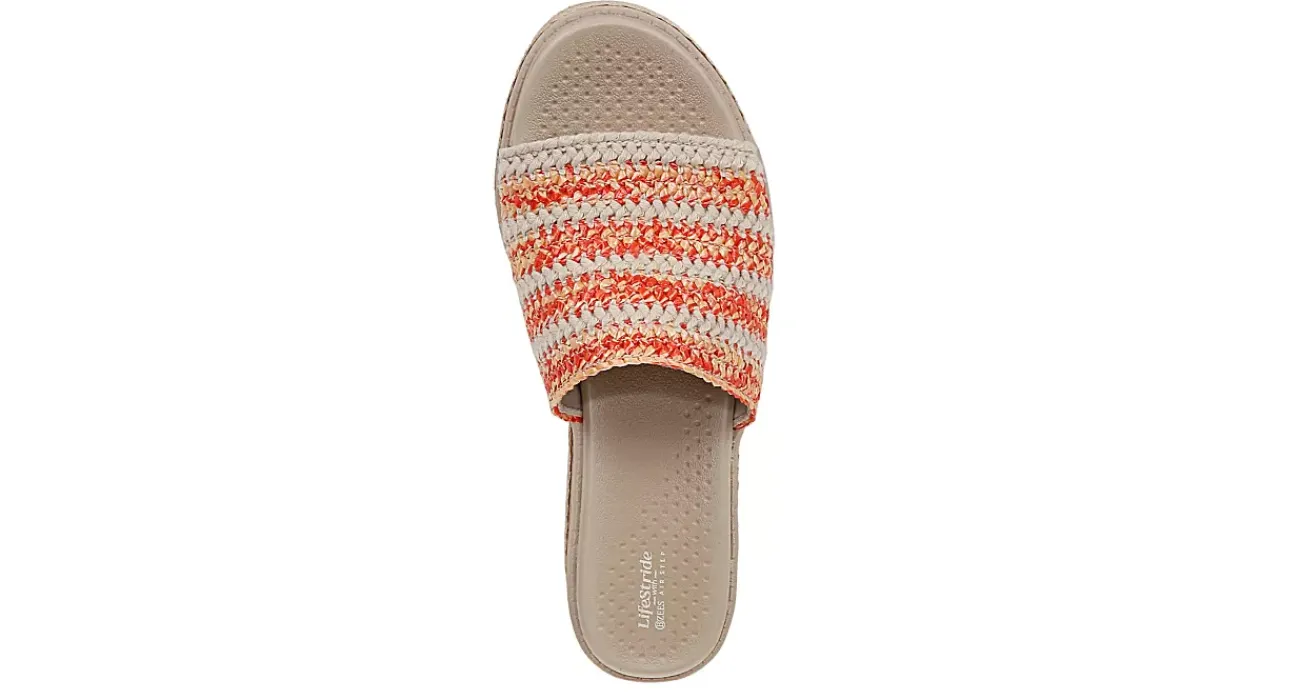 Ace laid-back style in the Breezy wedge sandal from LifeStride. Featuring a three-tone raffia upper with arch support for a comfy fit, this sandal also has odor control technology to keep feet fresh. The FreeFoam Comfort cushions every step, while the platform wedge adds just enough lift.