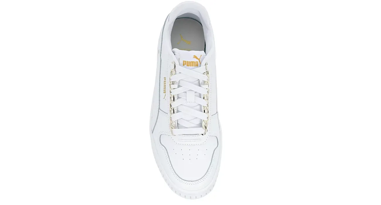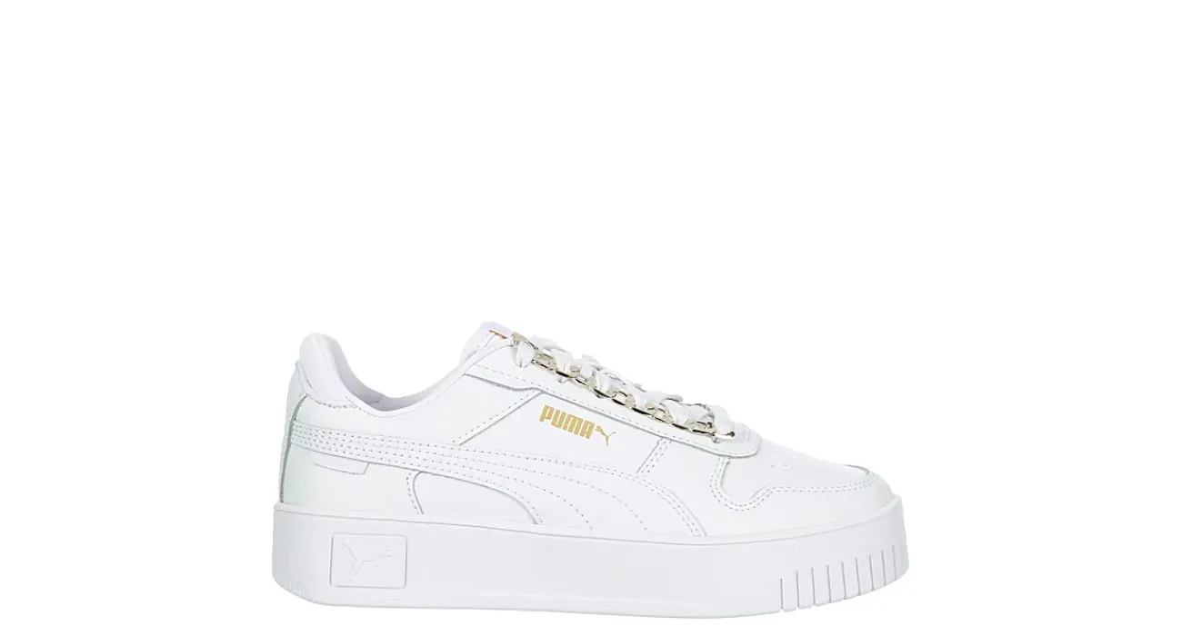 Elevate your streetwear style with the Carina Street women’s sneaker from PUMA. Featuring a leather upper with gold-tone lace accents, this lace-up sneaker also has the PUMA Formstrip and Cat logo on the heel for extra flair. The SoftFoam+ sockliner cushions your foot, while the rubber platform offers a slight lift.