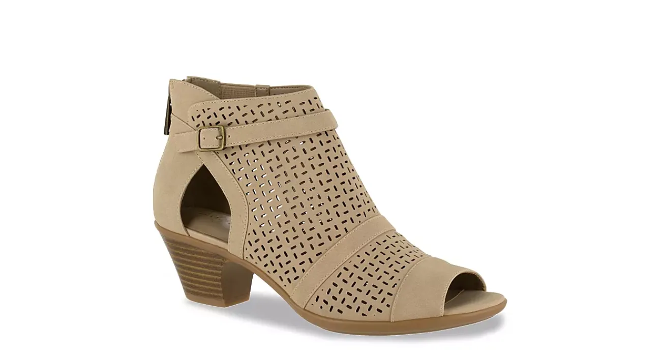 Add some sophistication to the fun of summer in the Easy Street Carrigan women’s shootie. With a faux leather upper and laser cutouts, this rear zip shoe + bootie gives structure to amp up all of your warm weather outfits. The padded footbed offers cushioning while the synthetic outsole provides stability.