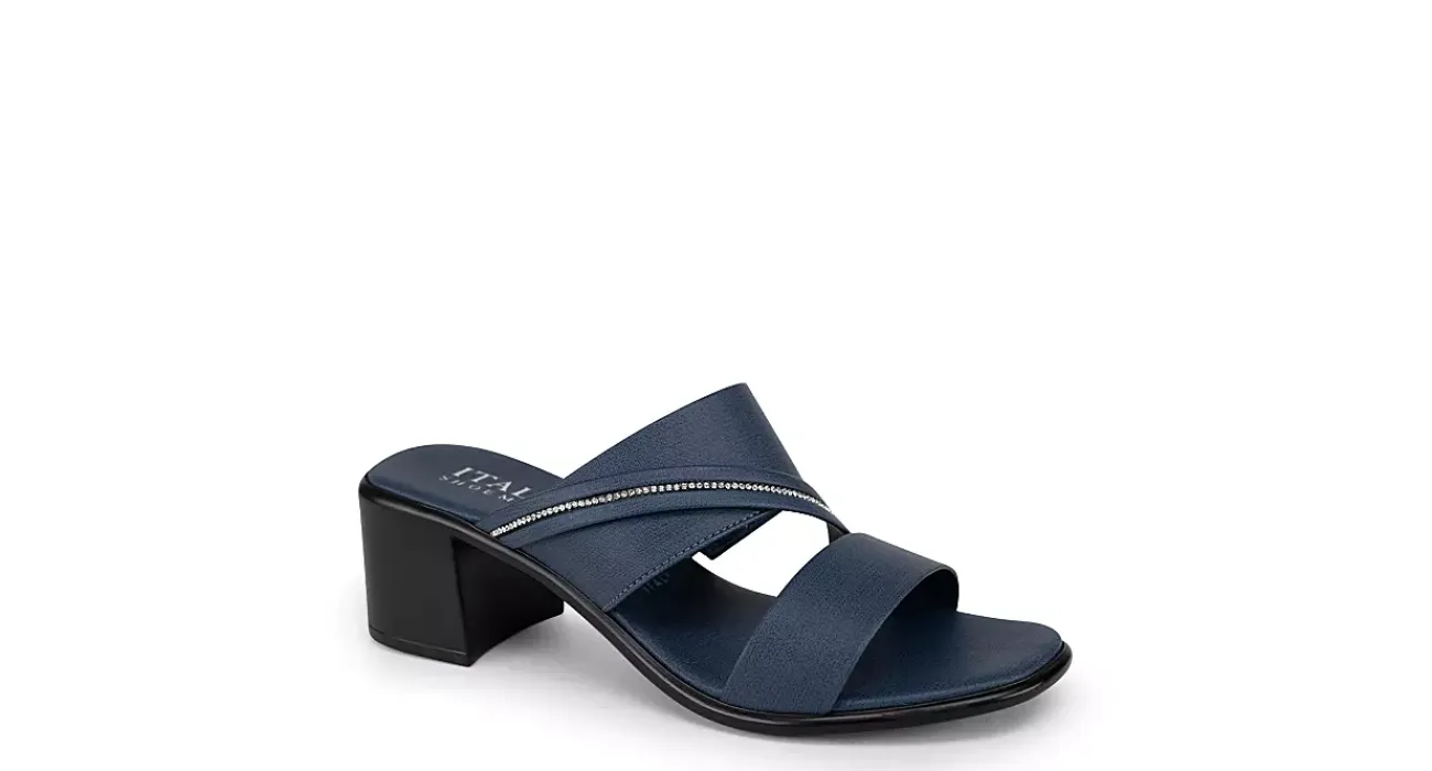 Friday nights call for the Coletty women’s slide sandal from Italian Shoemakers. With a faux leather upper featuring an asymmetrical strap highlighted by rhinestones for extra style, this slip-on also has a square toe. The footbed cushions your foot while the heel adds just enough lift.