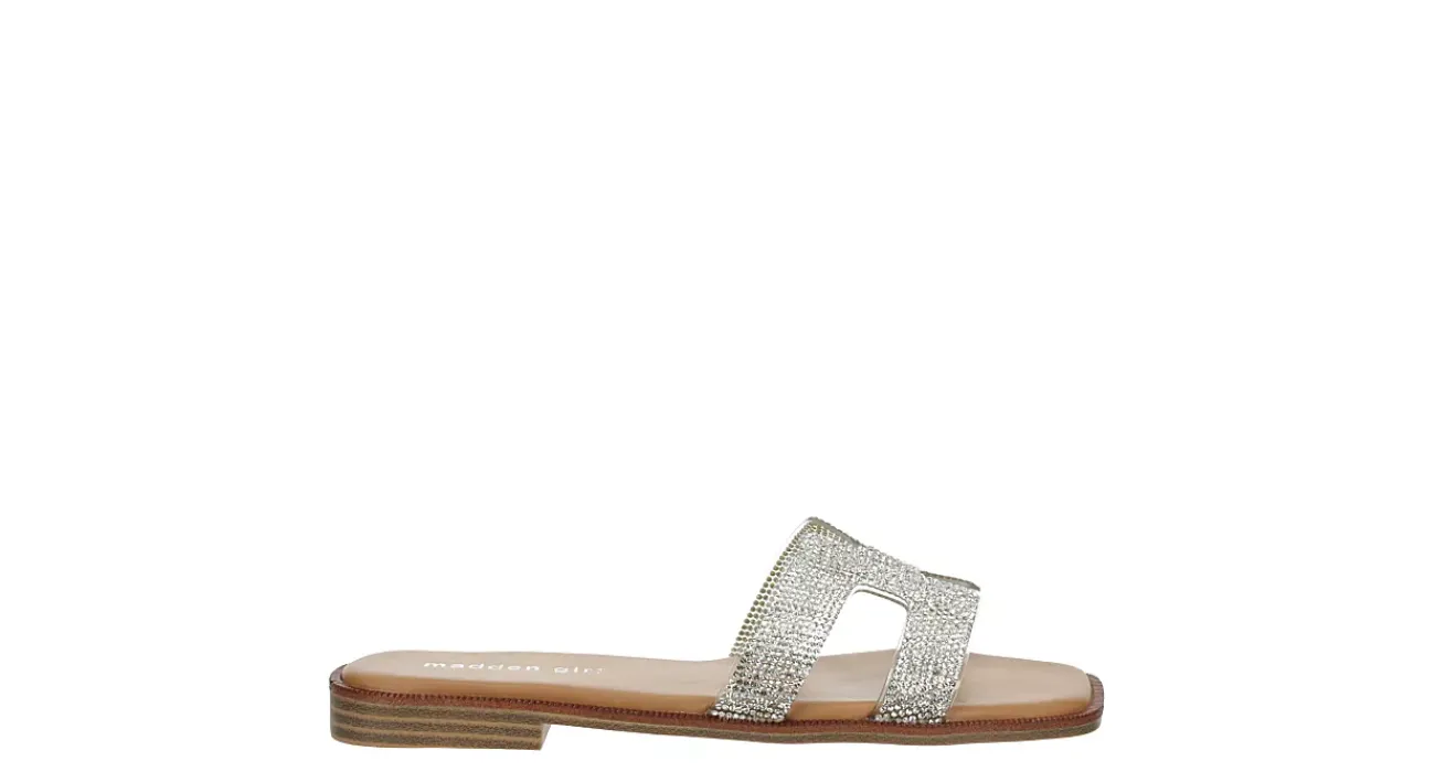 Glitz up your spring style in the Hailey-R women’s flat sandal from madden girl. Featuring a lucite & rhinestone upper with cutouts and a square toe for extra style, this slip-on shoe works with cropped jeans or midi skirts. The insole comforts your foot while the flat outsole offers durability.