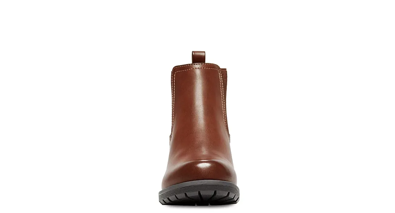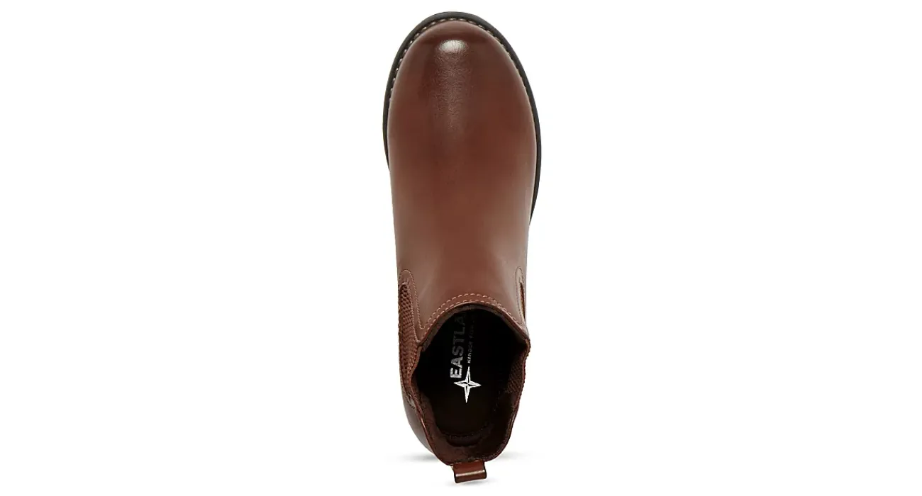 Sport timeless style in the Jasmine women’s Chelsea boot from Eastland. With a faux leather upper and dual elastic gores for secure fit, this pull-on Chelsea boot also features a fabric lining and rear pull tab. The removable Memory Foam insole adds extra comfort while the synthetic sole provides stability.