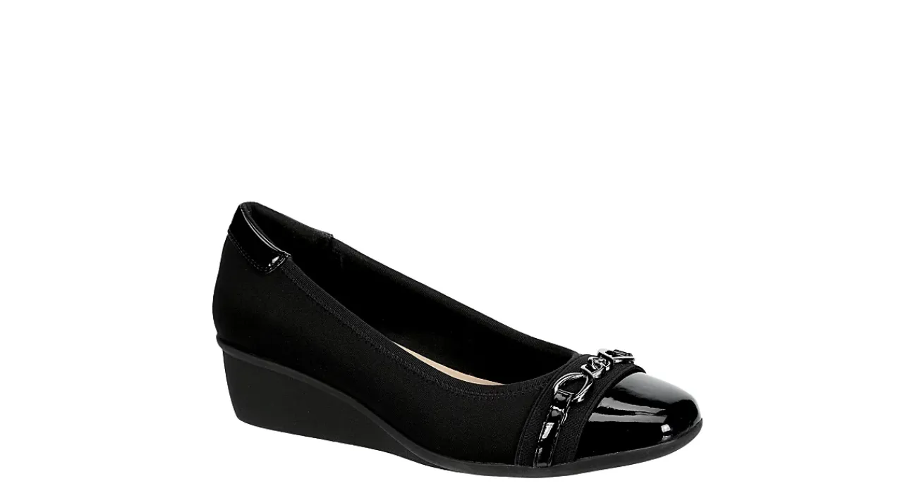 Slip into a perfect choice for the working world with the Lauren Blakwell Kit women’s pump. Featuring a textile & patent leather upper with a stylish patent leather cap toe and chain link detail, this pump does justice to business casual. The lightly cushioned footbed soothes your foot as the 1 1/2” wedge heel adds just enough lift.