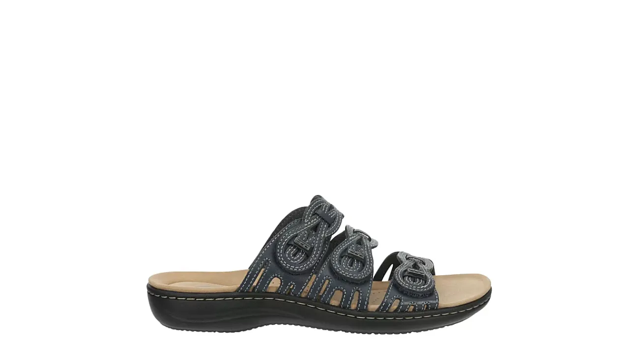 Live a little this summer in the Clarks Laurieann Ruby women’s slide sandal. With a leather upper featuring three interwoven straps for a secure fit, this riptape sandal is perfect for travel and exploring. The Ultimate Comfort footbed cushions with OrthoLite® breathability while the lightweight outsole improves flexibility.