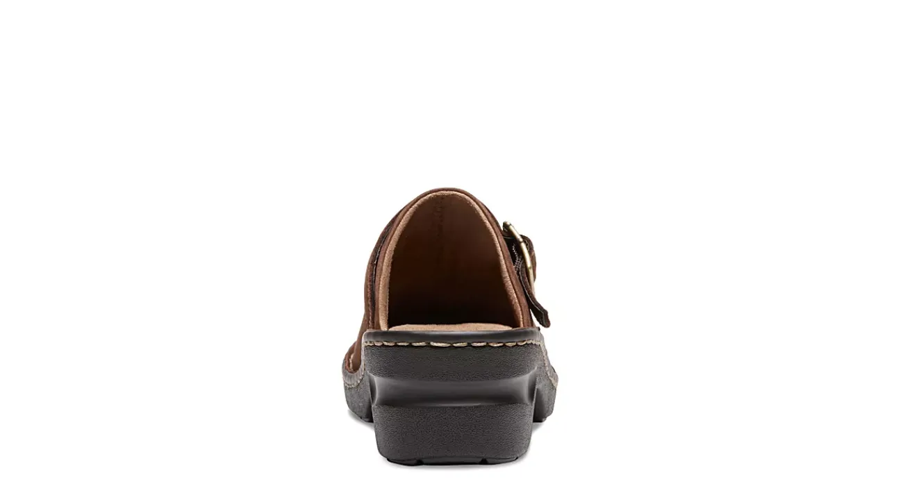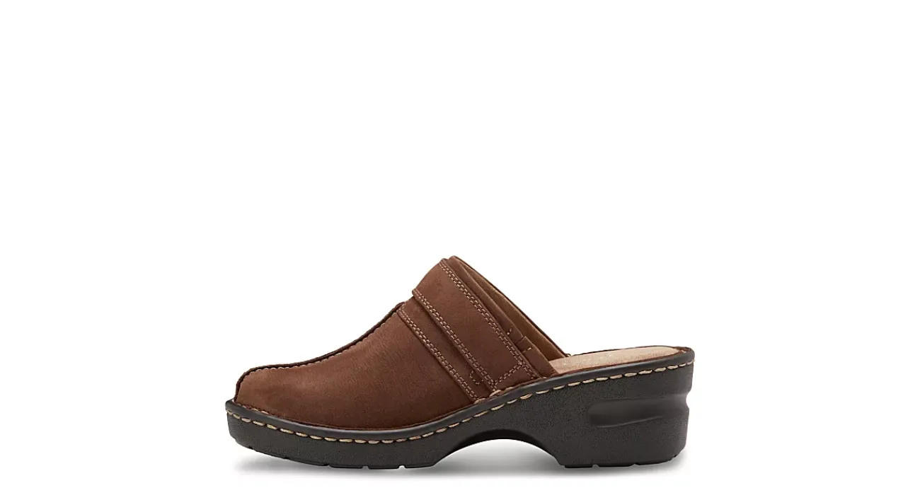 Add a clog loaded with style versatility to your wardrobe with this Eastland Mae. The leather or nubuck upper has a closed toe clog design with contrast stitching and an overlay adjustable buckle for a clean look. The 2″ heel lifts your silhouette to make this the perfect clog for any outfit in your closet.