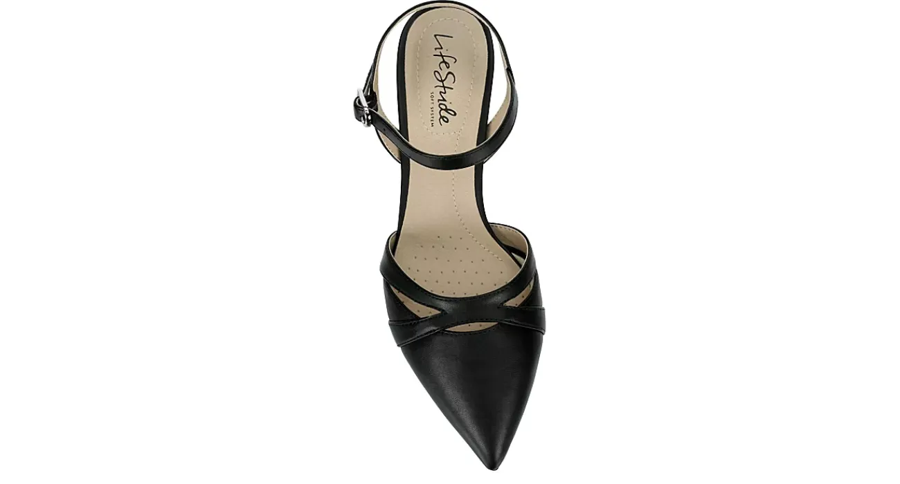 Work softly in the elegant Marlee women’s pump from LifeStride. Featuring a faux leather upper with a X-strap detail on the vamp, this buckle strap shoe has built-in stretch for a secure fit. The Soft System® comfort package supports & cushions your foot while the low heel adds stability.