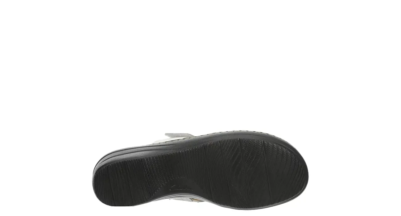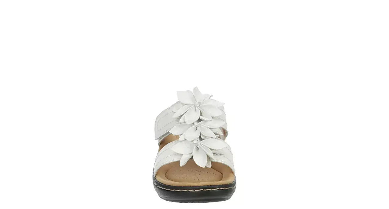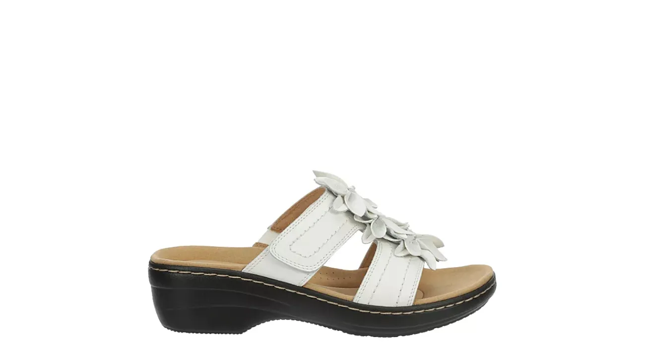 Bloom into warmer looks for spring in the Clarks Merliah Raelyn women’s wedge sandal. With a leather upper featuring two bands with hook & loop tape for a secure fit, this slip-on sandal is such a cute addition to your closet with its big flower details. The Ultimate Comfort foam footbed cushions and cradles your foot, while the textured outsole provides traction and durability.