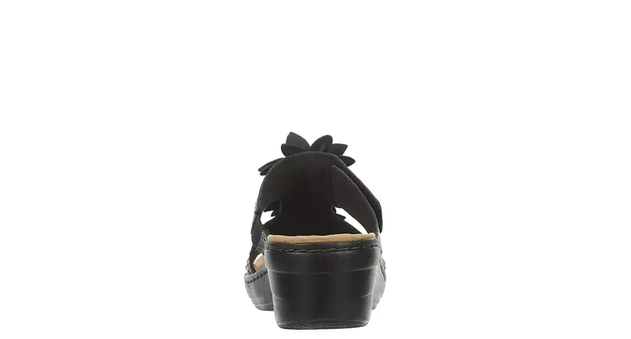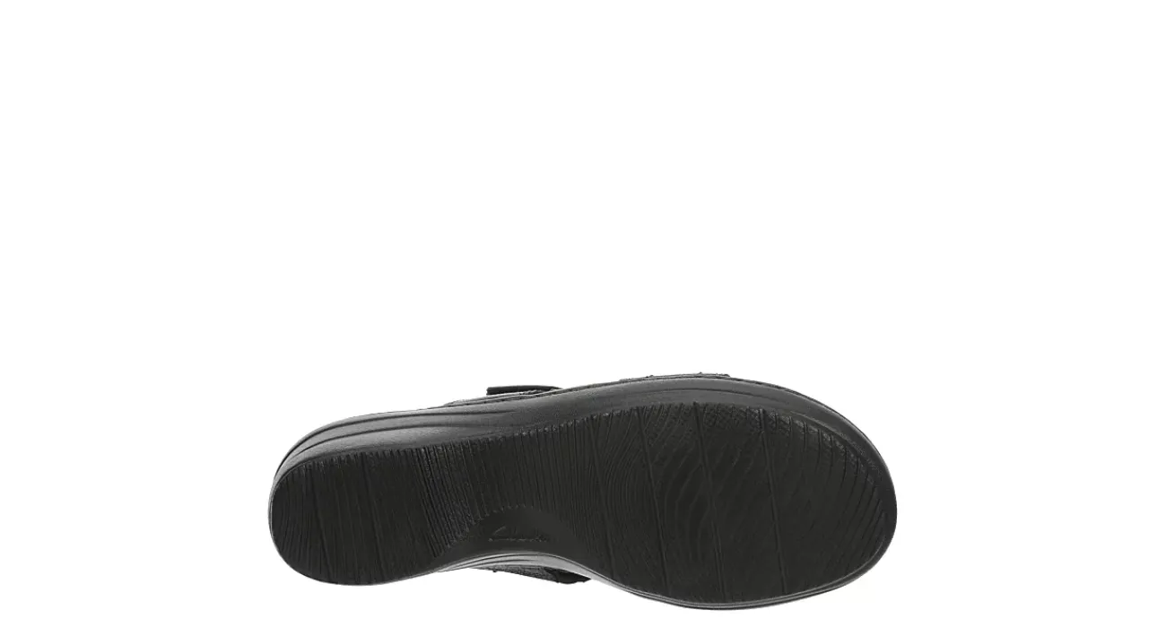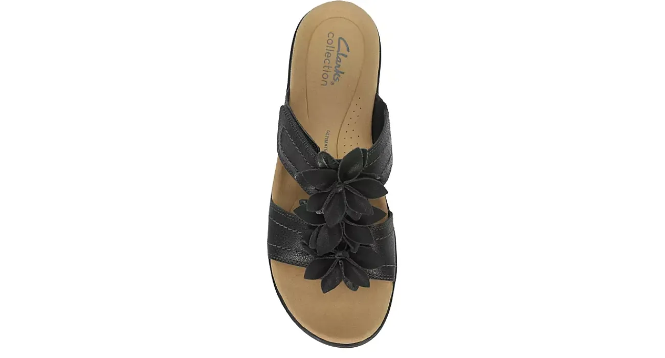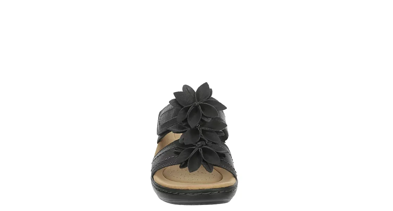Bloom into warmer looks for spring in the Clarks Merliah Raelyn women’s wedge sandal. With a leather upper featuring two bands with hook & loop tape for a secure fit, this slip-on sandal is such a cute addition to your closet with its big flower details. The Ultimate Comfort foam footbed cushions and cradles your foot, while the textured outsole provides traction and durability.