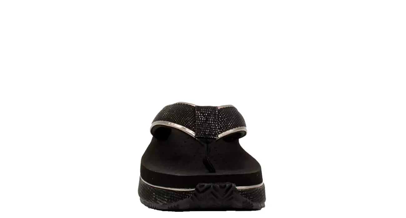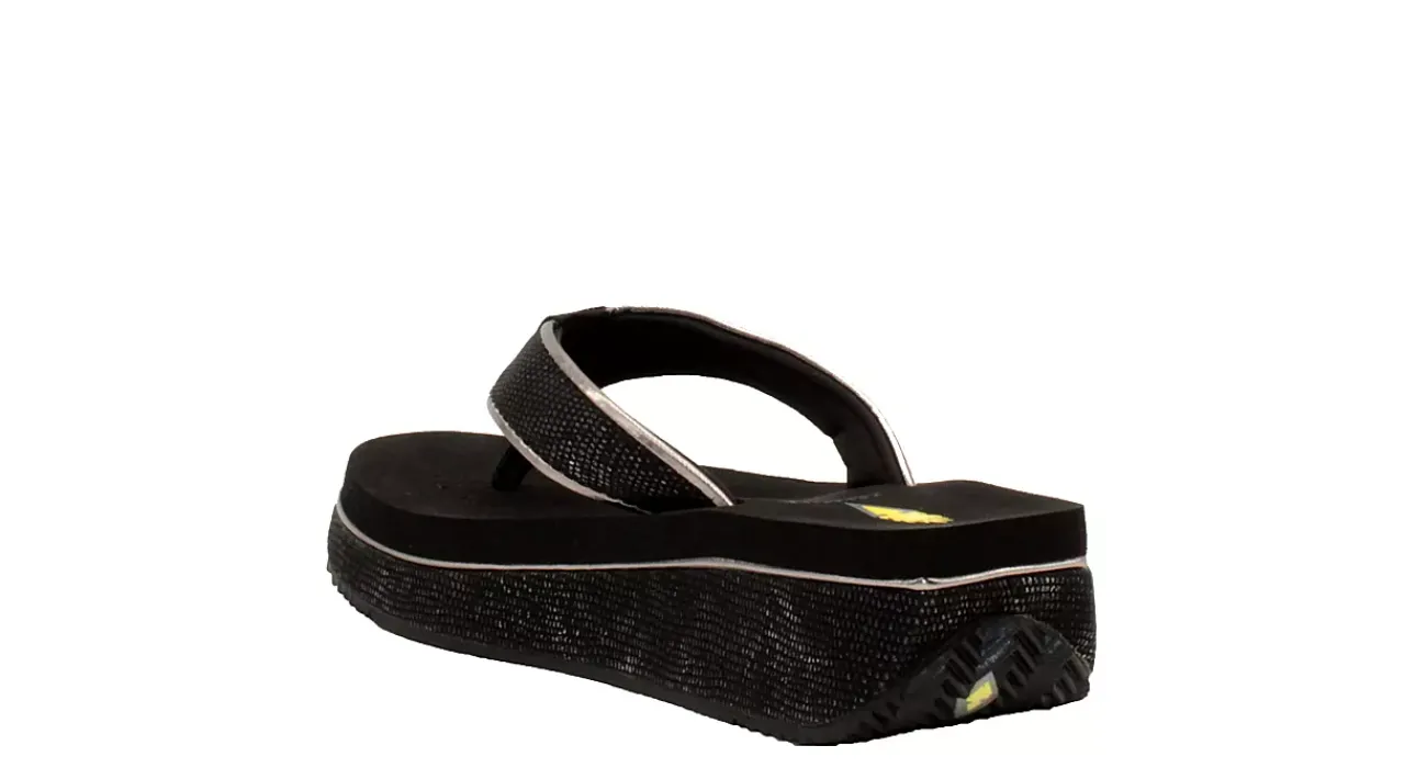 Enjoy your vacation, happily grazing in the Neville flip flop sandal from Volatile. Featuring a padded lining and squared off wedge heel for stability, this metallic faux leather thong also has a protective toe bumper. The signature ultra-comfort insole cushions, while the nonskid outsole is suitable for all surfaces.