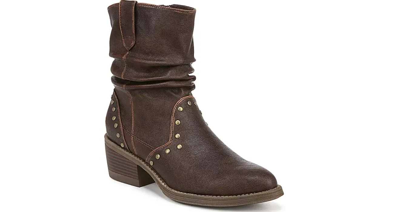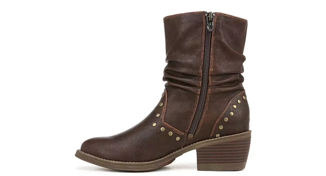 Blend your style with attitude in the Rebel Western boot from Blowfish Malibu. Featuring a faux leather upper with a studded trim & slouchy styling, this easy zip bootie also has a sleek almond toe. The foam cushions, while the low heel adds just enough lift.