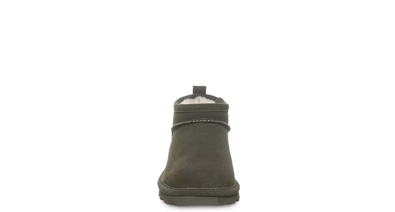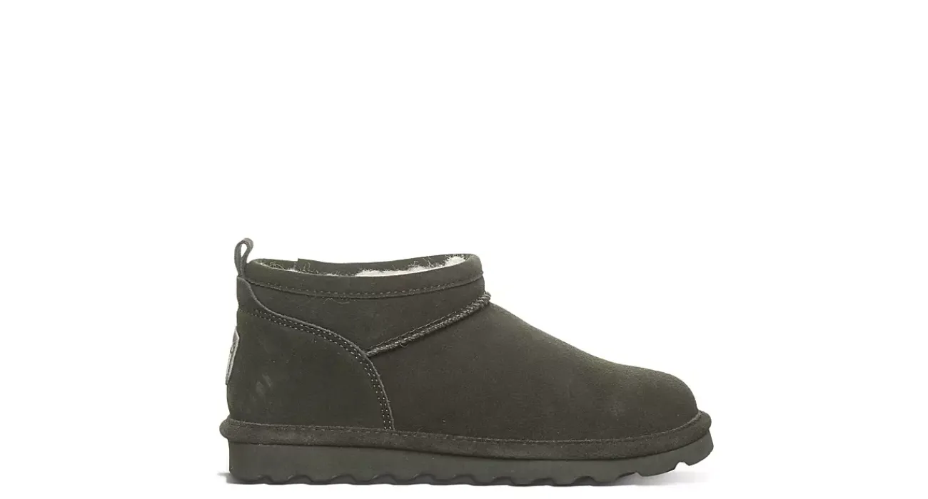 Keep that warm profile lower in the Super Shorty women’s fur boot by Bearpaw. With a suede upper treated with BearCoat™ Rain and Stain Repellent to protect against the elements, this pull-on bootie is still perfect for cold days out and about. The lining & footbed offer warm cushioning while the outsole adds some traction to your unbothered steps.