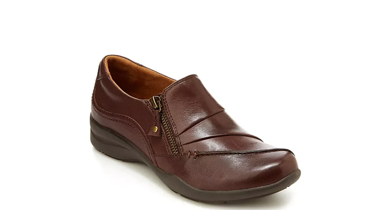 An all-purpose shoe like the Thea women’s clog from Jambu comes in handy. Featuring a leather upper with a ruched design for extra style, this outside zip shoe also has side goring. The footbed cradles your foot, while the All Terra Traction keeps you steady.