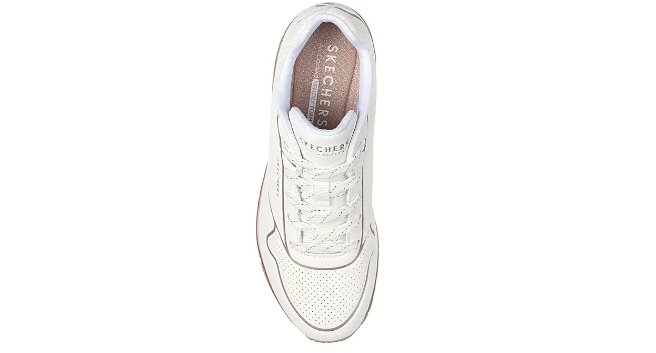 A hint of cool shine is all you need in the Skechers Uno – Cool Hints women’s sneaker. With a perforated faux leather upper with fun metallic trim, this lace-up sneaker comes with a metallic Skech-Air air-cushioned midsole for a modern style sure to turn heads. The Air-Cooled Memory Foam insole and traction outsole comfort your foot and absorb shock to keep you moving in the light.