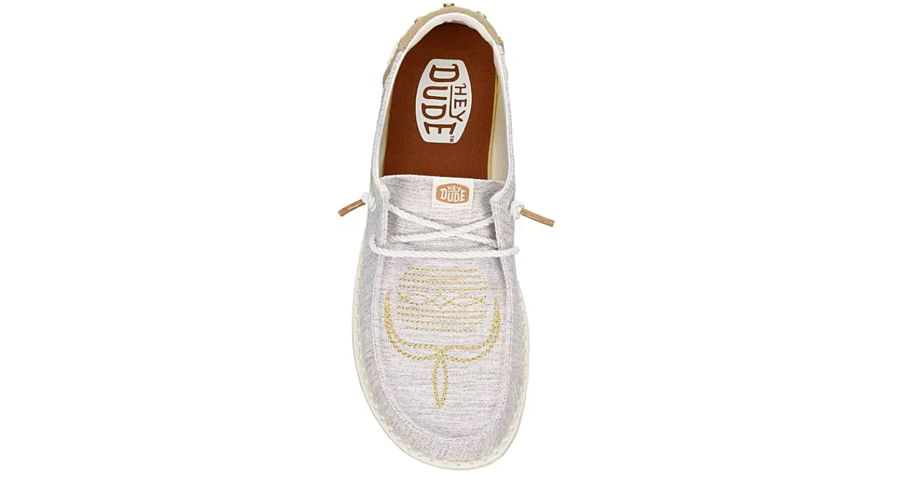 Relax into your Southwest passion with the HEYDUDE Wendy Cactus women’s slip-on sneaker. With a washed cotton upper featuring a Flex & Fold technology and embroidered details for extra style, these neutral HEYDUDE shoes have hand-stitching at the heel. The removable Memory Foam insole and leather lining offer ergonomic support and cushioning while the patented EVA outsole sets you free to explore unfettered.