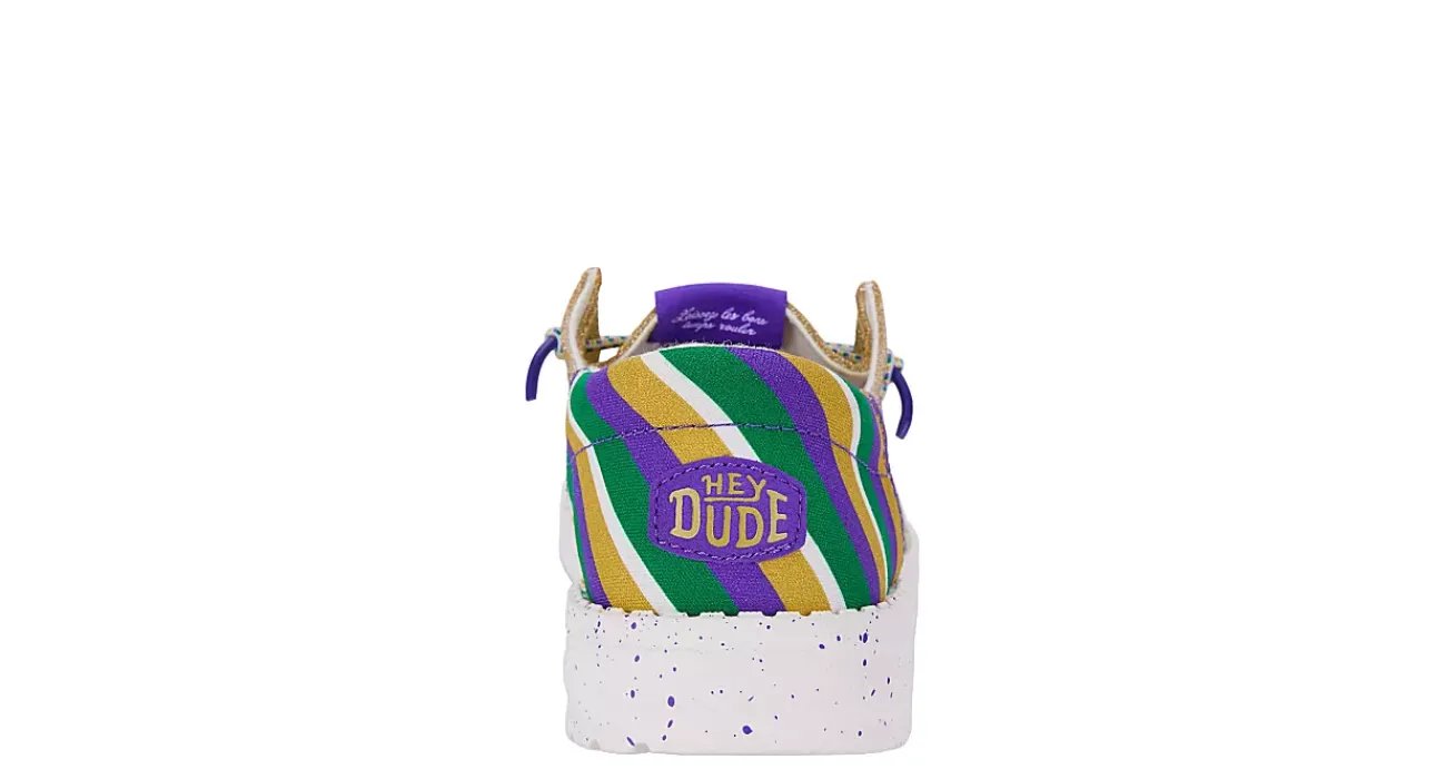 Celebrate “Fat Tuesday” in the HEYDUDE Wendy Funk Mardi Gras Party slip-on sneaker. With a glitter textile upper featuring bead detailing on the laces and a speckled midsole for extra style, this shoe gets you in the spirit to party. The beaded print insole cushions, while the EVA outsole sets you free to explore unfettered.