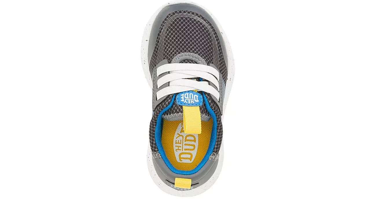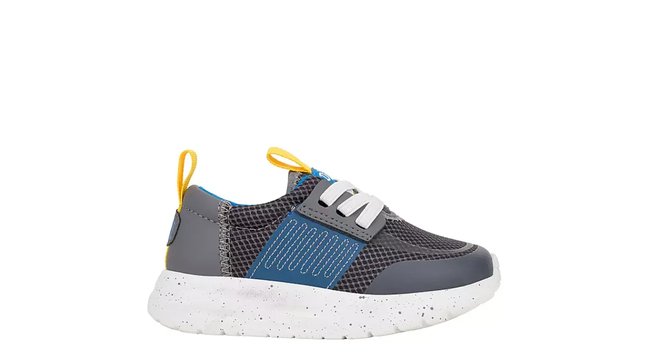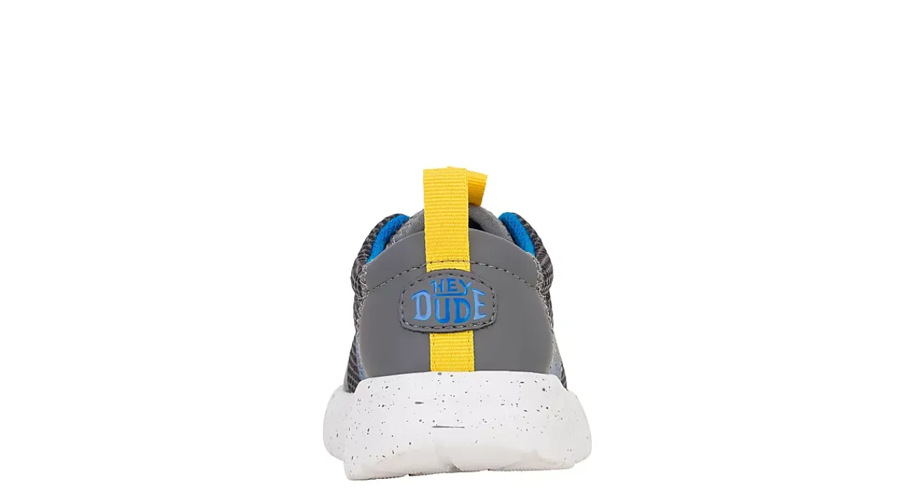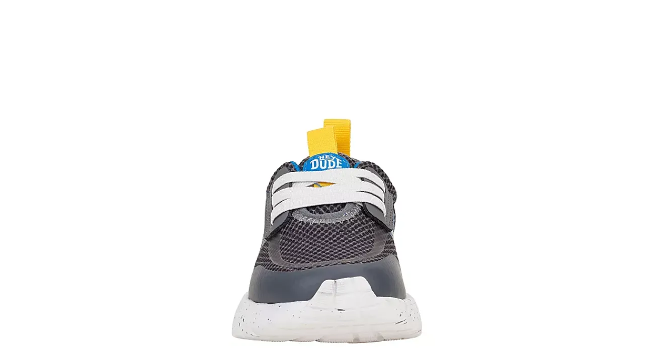 He’ll enjoy every step in the HEYDUDE Sirocco Play Toddler sneaker. With a colorblock mesh upper, treated with water repellent spray, featuring dual pull tabs for easy entry, this slip-on sneaker is summer ready. The removable insole cushions his little foot, while the lightweight outsole keeps him going for hours.