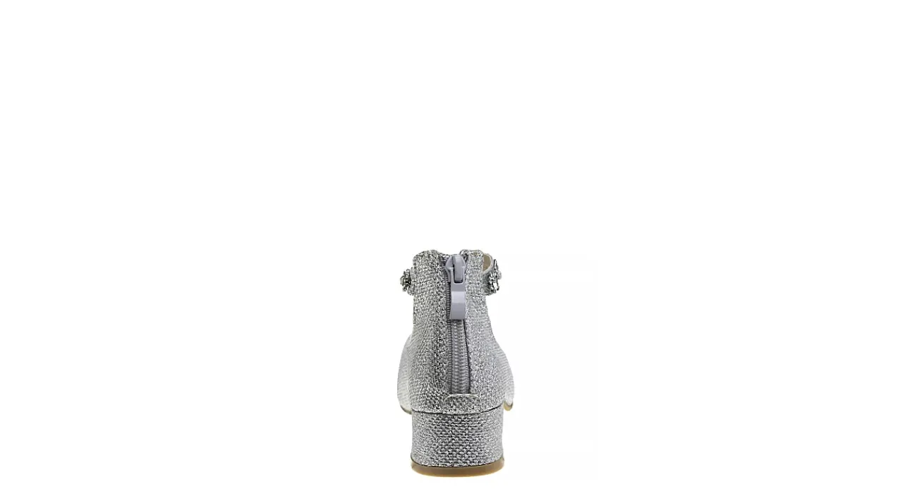 Start her foray into heeled shoes off right with the Glitter Mesh girls’ dress pump from Badgley Mischka. Featuring a synthetic upper with a sparkly glitter mesh overlay and an ankle strap adorned with crystals for extra flair, this rear zip shoe is elegant and versatile. The lightly cushioned footbed soothes her foot while the low block heel adds just enough lift.