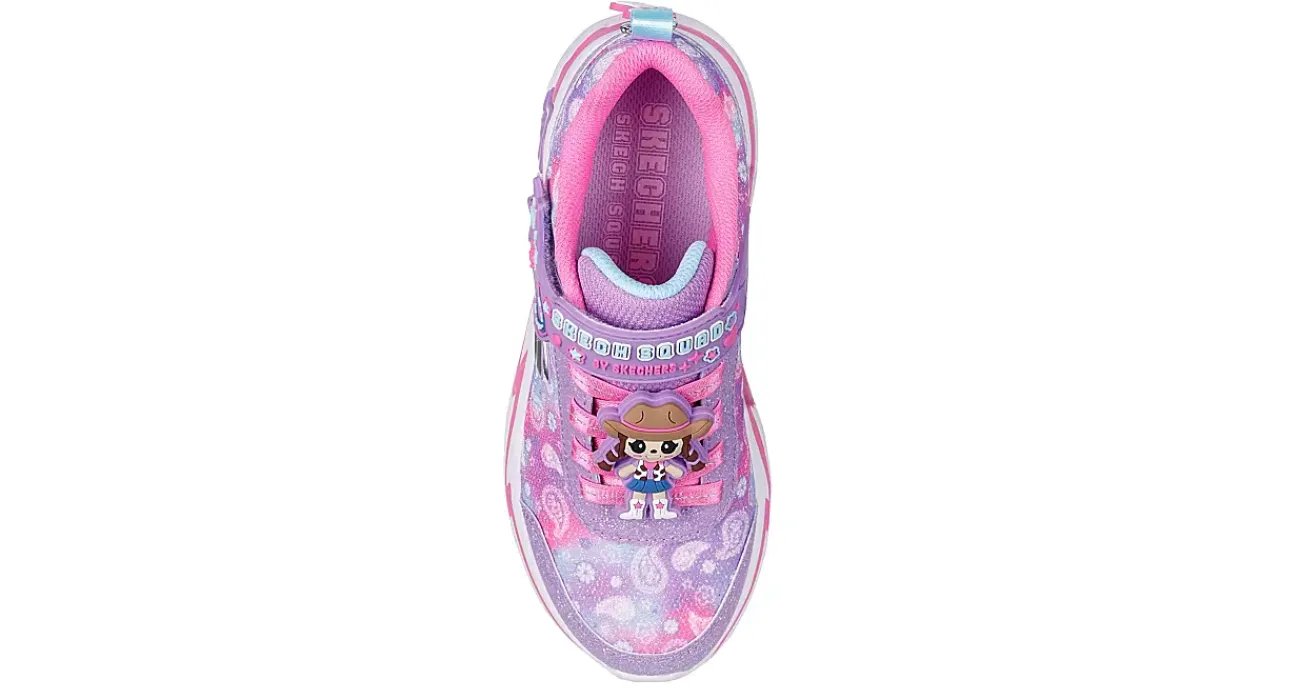 Skech Squad team up in the Skechers Snuggle Sneaks: Skech Squad sneaker. With a glitter finished fabric & synthetic upper featuring a character themed design, this stretch laced shoe sports Skechers Adaptive Closure for a customized fit. The insole cushions, while the outsole adds flexible traction.