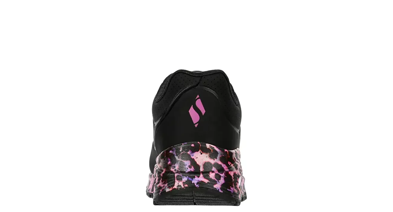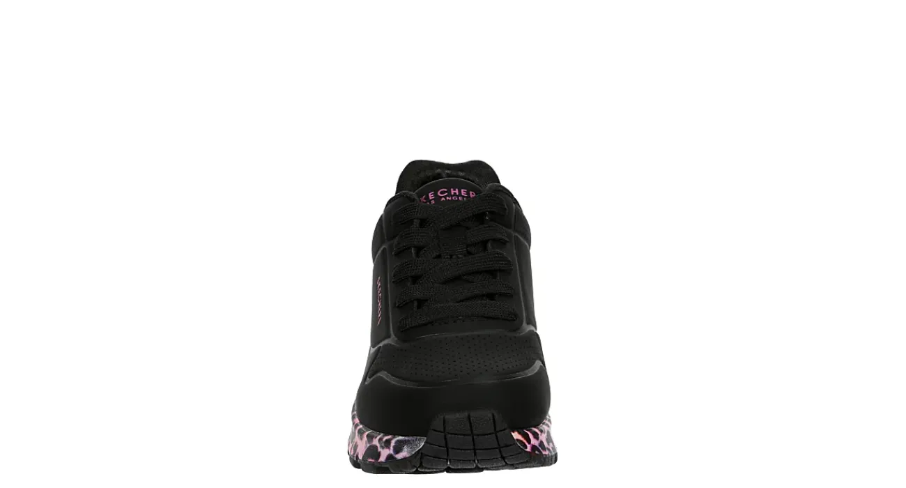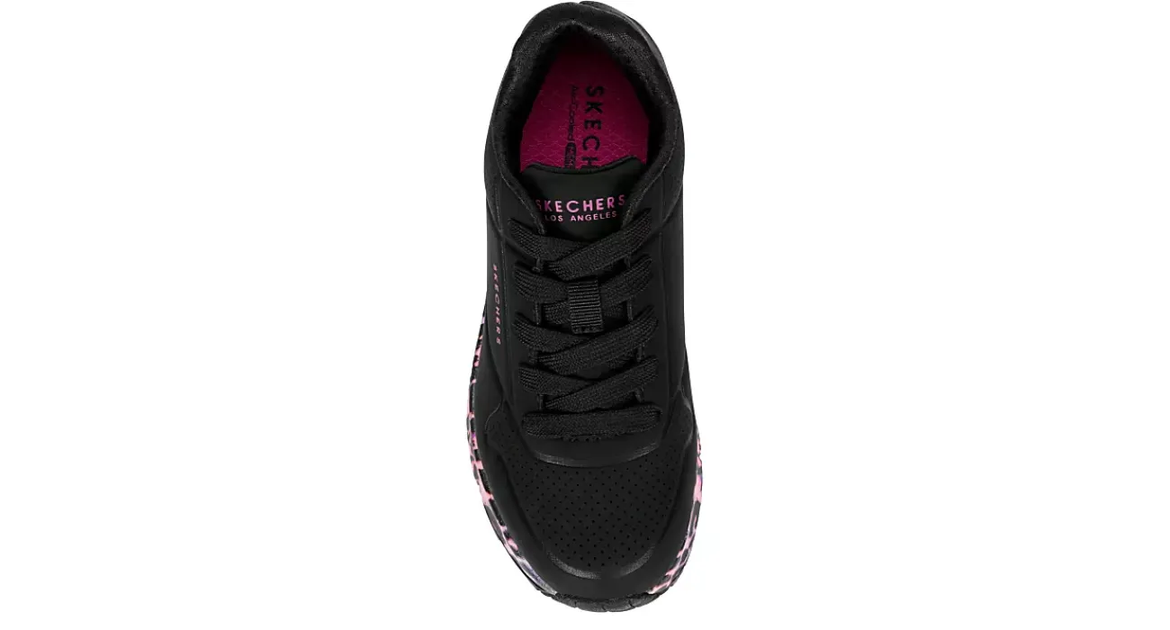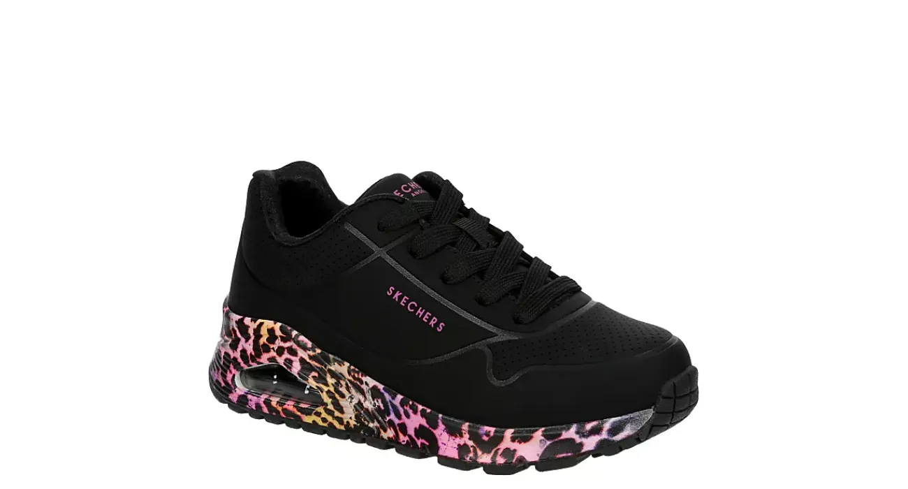 Bold her style in the Skechers Uno sneaker. With a synthetic upper and airbag heel, this lace-up sneaker comes in fun colors for a modern style sure to turn heads. The Memory Foam insole & colorful leopard print midsole comfort her foot while absorbing shock to keep her moving.
