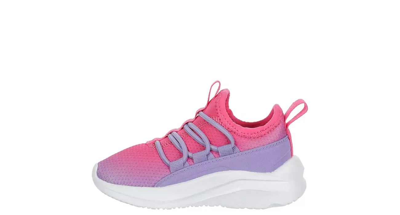 She’ll look too cute in the PUMA Softride One4All infant girls’ sneaker. With a mesh & synthetic upper featuring dual pull tabs for easy entry, this slip-on shoe is versatile enough to keep up with her. The foam footbed & SOFTRIDE midsole cushion every step while the outsole offers bouncy traction.