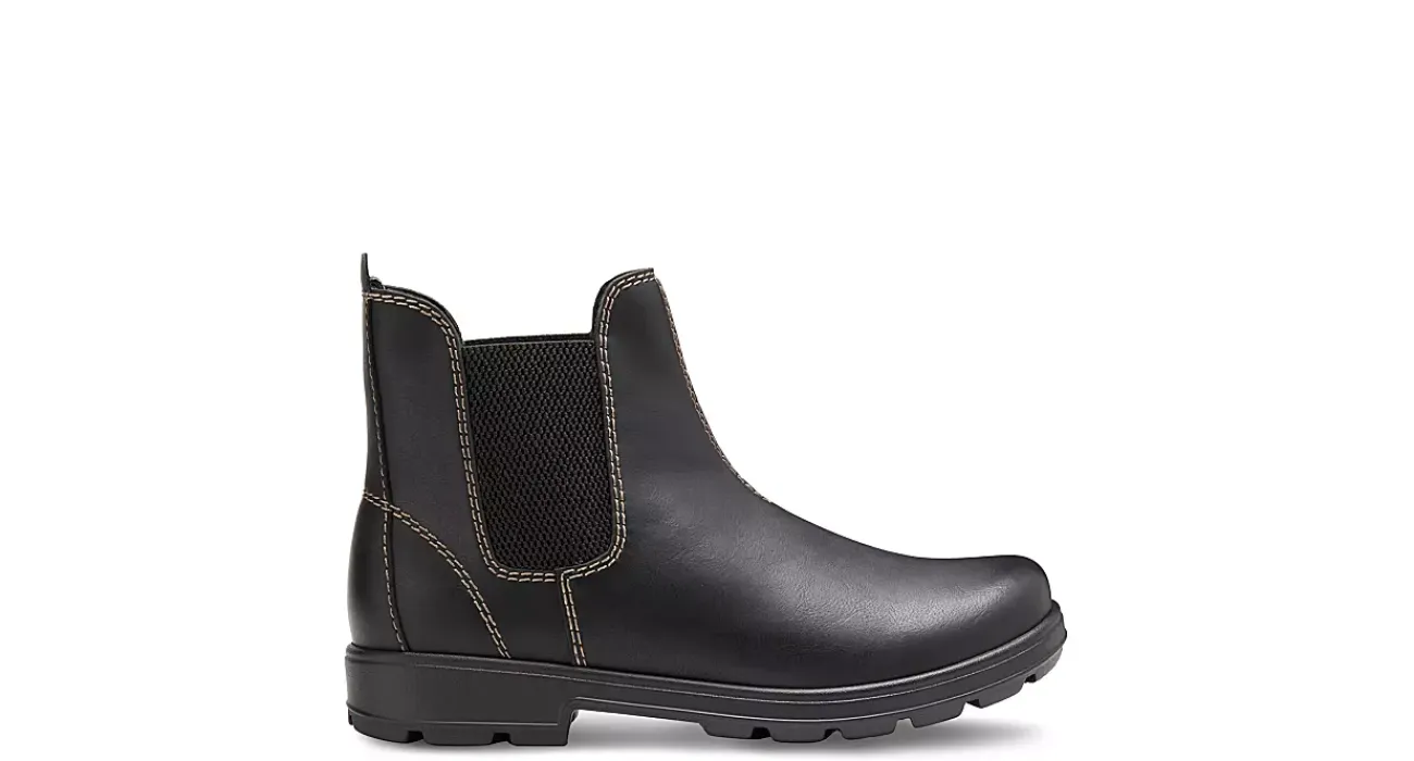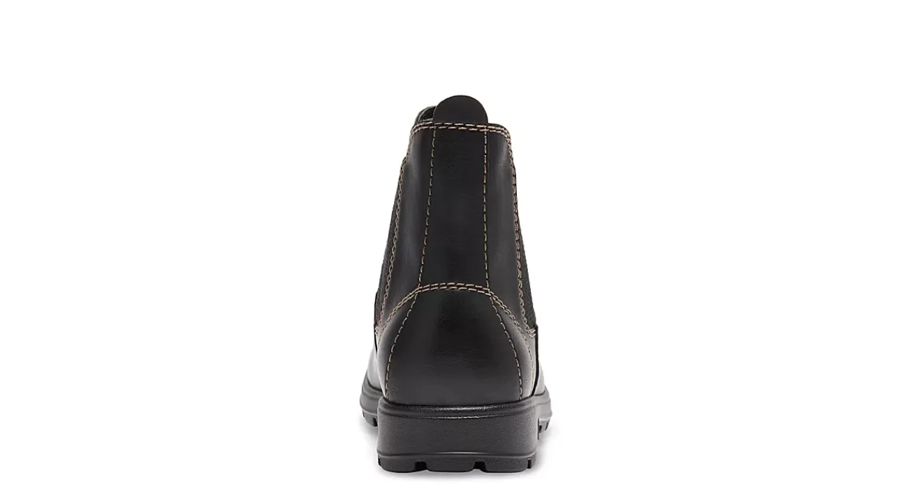 Easily boost your style with the Cyrus Chelsea boot from Eastland. Featuring a faux leather upper and elastic goring, these 5 1/2″ boots fit right in with jeans or slacks. The fabric-lined Memory Foam insole cushions while the small block heel adds subtle lift.