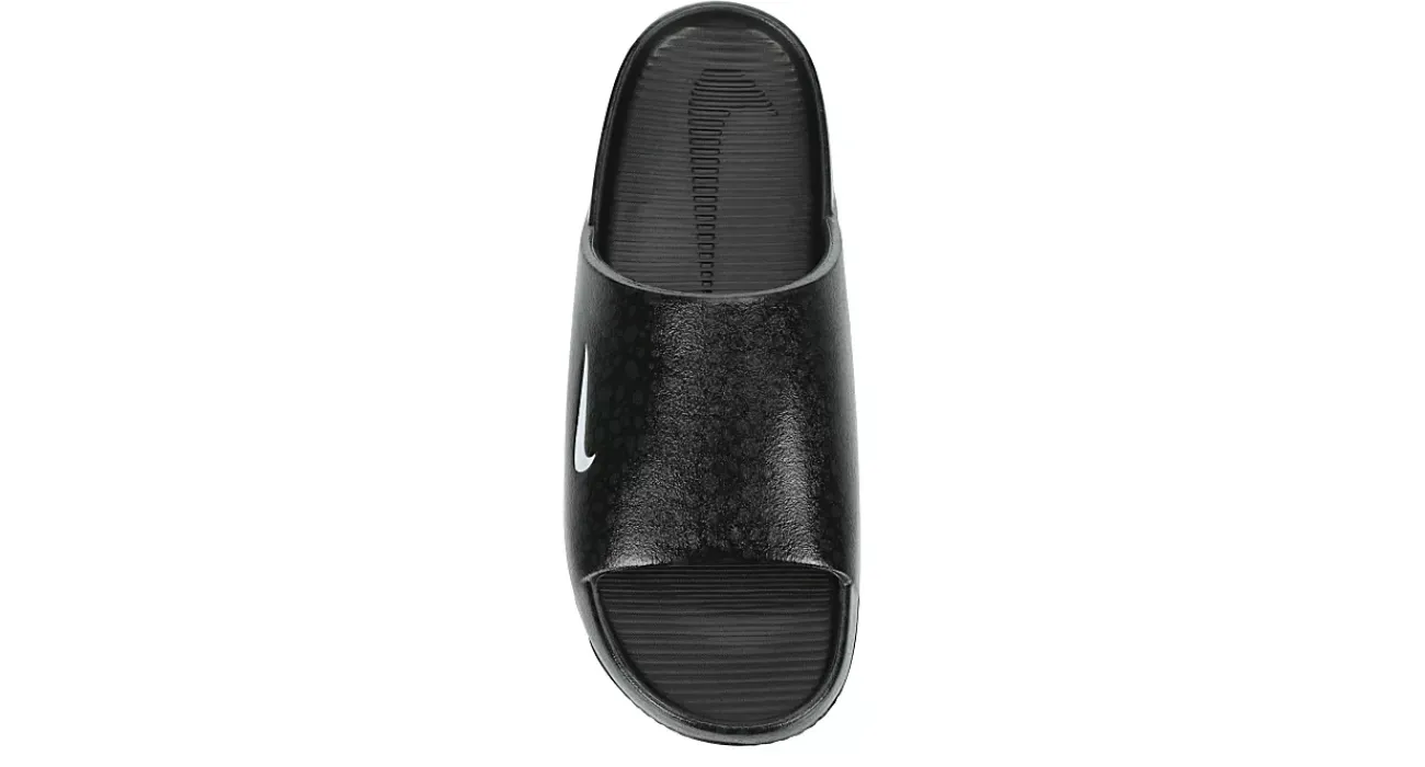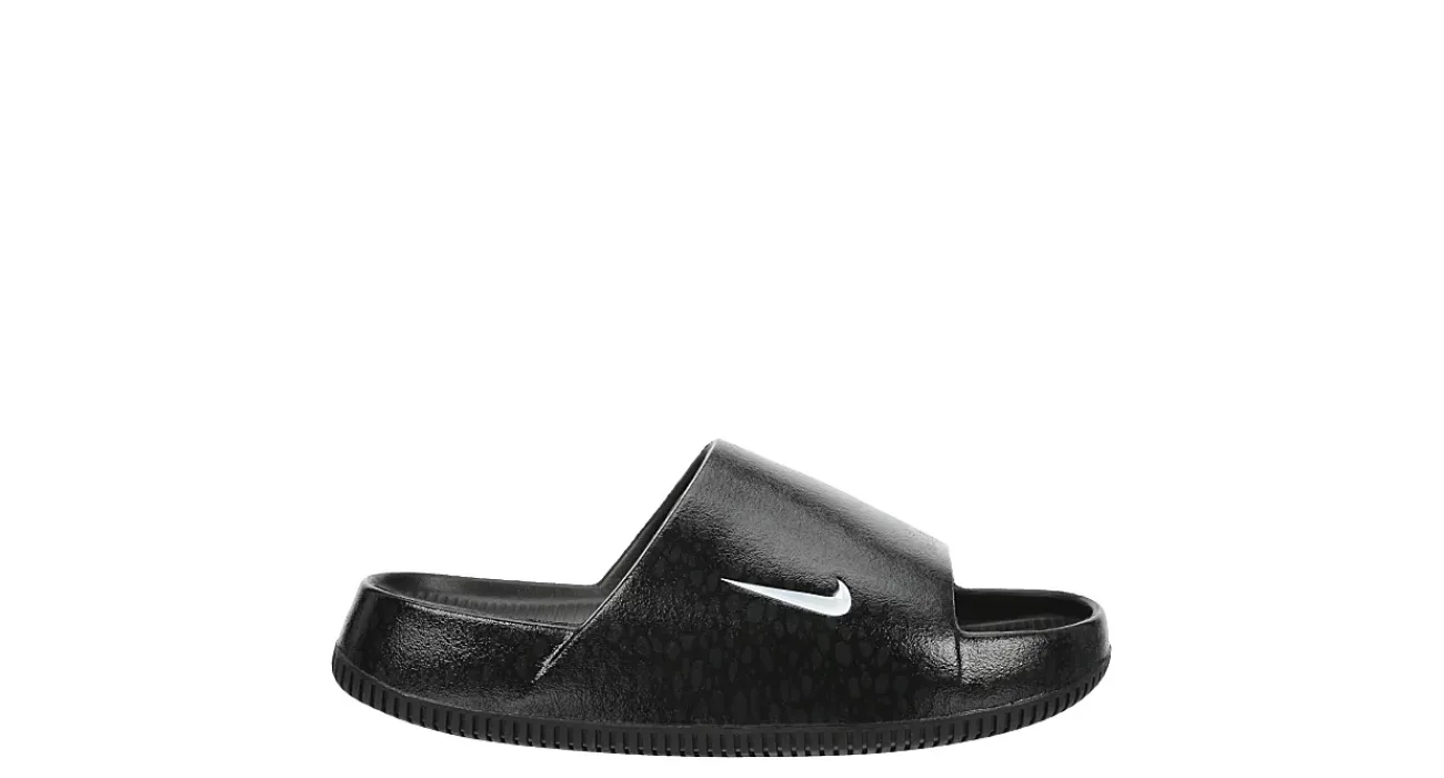 Dial down your stress in the Calm women’s slide sandal from Nike. Featuring a water-friendly, single piece upper with a contoured fit for a soothing feel, this black & white slide works everywhere from the streets to the pool. The foam footbed cradles your foot while the subtly textured outsole adds some traction.