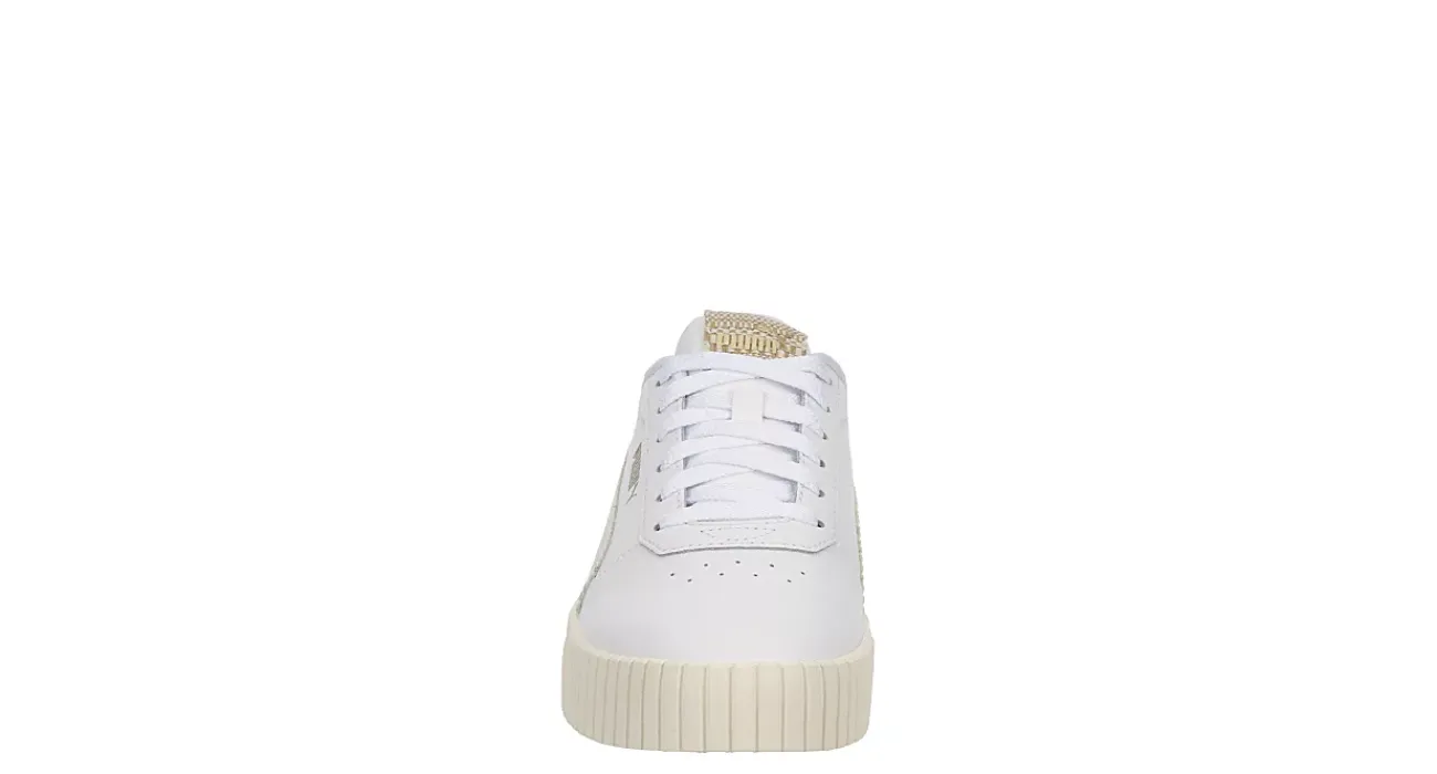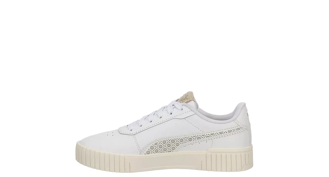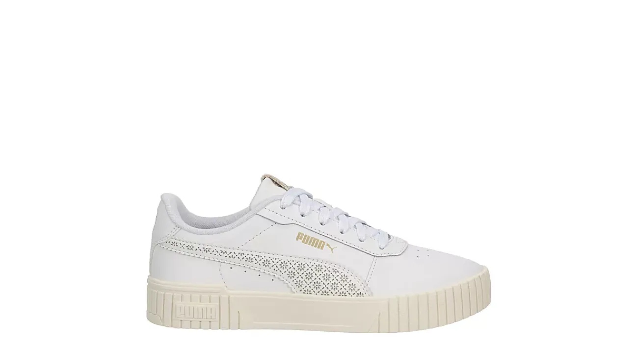 Stay golden in the ’80s-inspired Carina 2.0 Coast women’s sneaker from PUMA. With a leather upper featuring the iconic Formstrip with small, floral laser cut details for extra style, this lace-up shoe also has a perforated vamp to stay cool. The SoftFoam+ cushioning provides step-in comfort with the thick rubber sole.