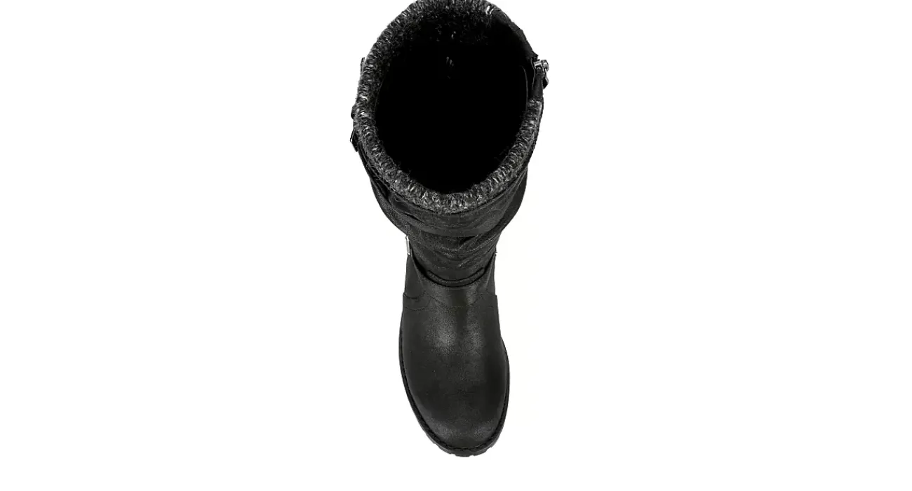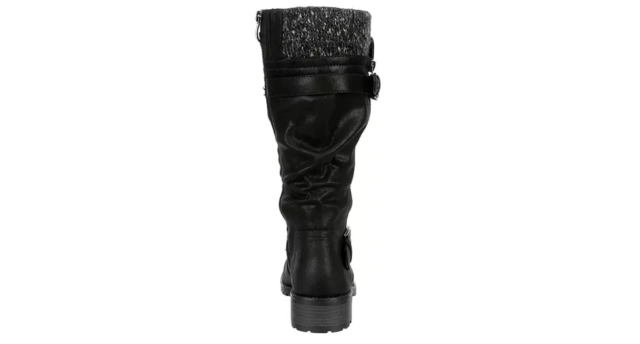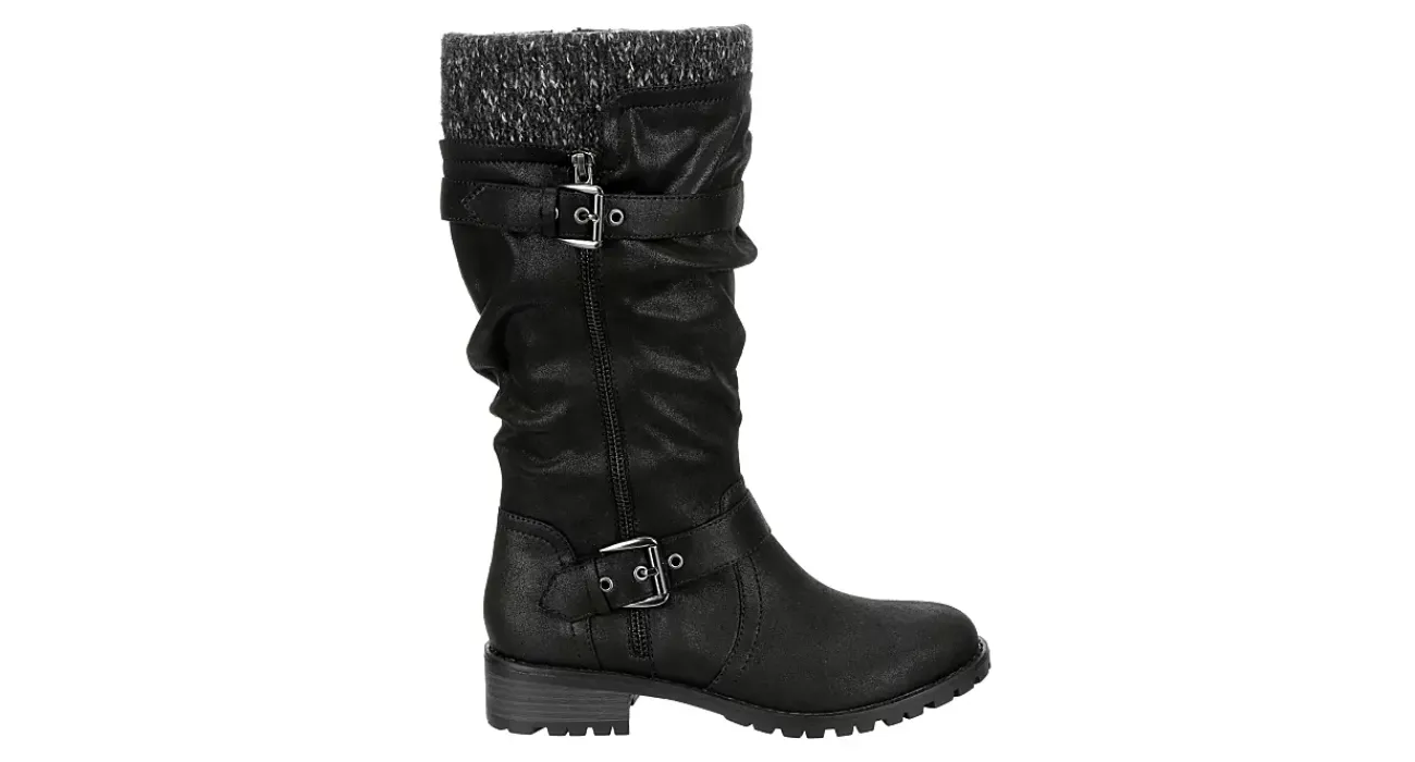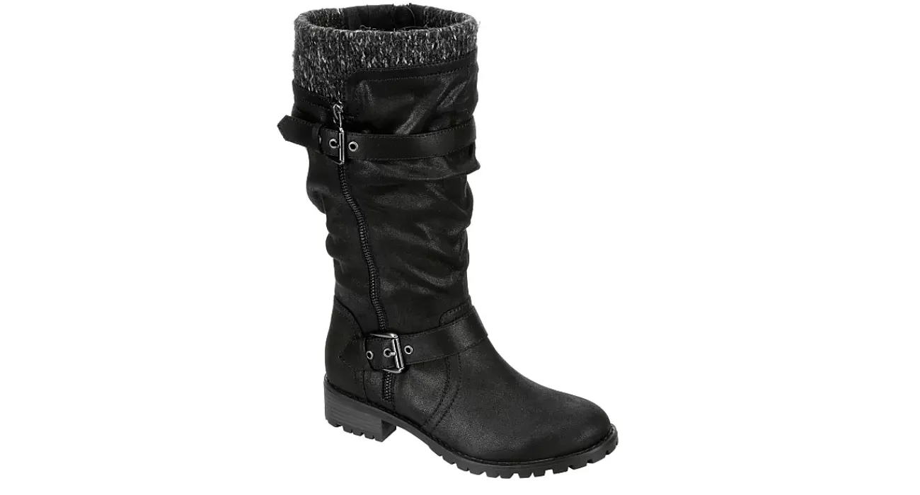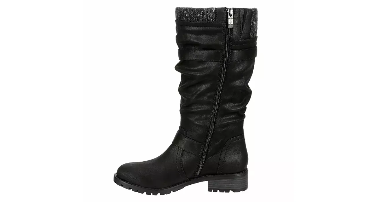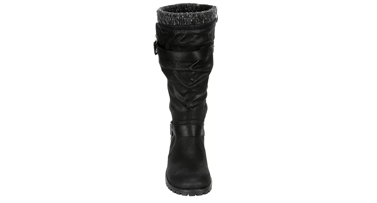 Look fashionable in the frosty air with the Chelsey boot from Xappeal. Featuring a faux suede upper with a sweater-inspired collar to for style, these black boots make your wardrobe pop. The durable lug-style outsole supports every step while the buckle details add cuteness.
